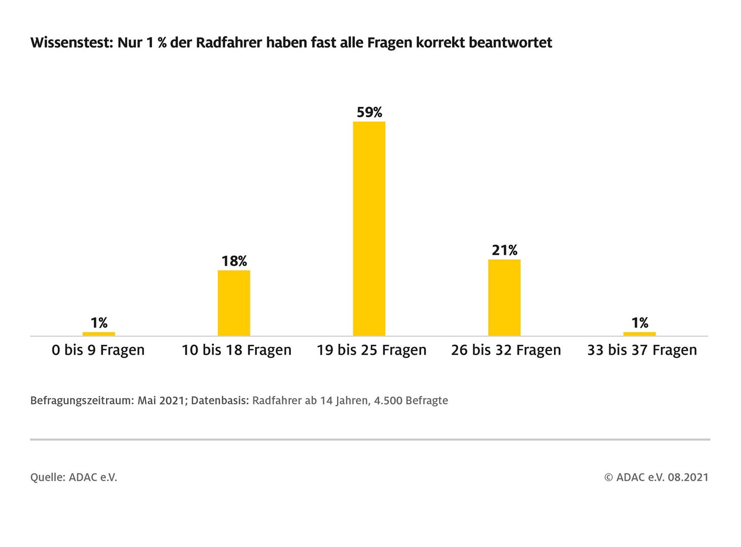 Fahrradfahrer gehören zu den gefährdetsten Verkehrsteilnehmern, 2020 verunglückten 92.273 Radfahrer, davon 426 tödlich. (Quelle: Statistisches Bundesamt). Umso wichtiger ist es, dass Radfahrer die Verkehrsregeln kennen. Der ADAC hat deutschlandweit 4.500 Radfahrer ab 14 Jahren einen Wissenstest absolvieren lassen. Ergebnis: Nur ein Prozent konnte fast alle Testfragen korrekt (90 oder mehr Prozent) beantworten, im Durchschnitt waren 60 Prozent der Antworten richtig.