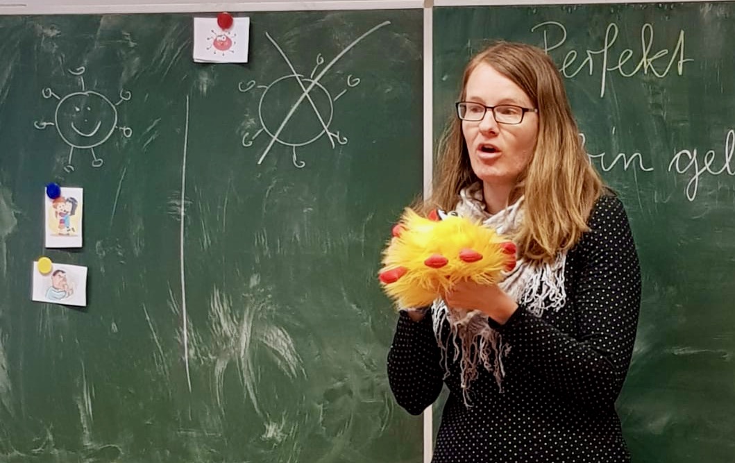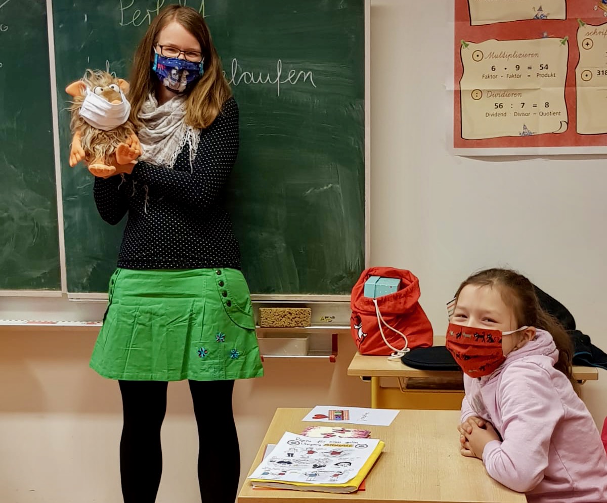 Auch für die Schüler, die wieder in den Unterricht dürfen, sollte es zunächst nur ein Video mit den Verhaltensregeln geben, doch dann hat sich Claudia Schrade, die als Logopädin arbeitet, entschieden, live mit „Mumpitz“ in den drei ersten Klassen aufzutreten. Da die Klassen geteilt werden mussten, hatte sie also sechs Einsätze – ehrenamtlich in ihrem Urlaub. Unterstützung bekam „Mumpitz“ bei der Aufklärung von „Cora Corona“.