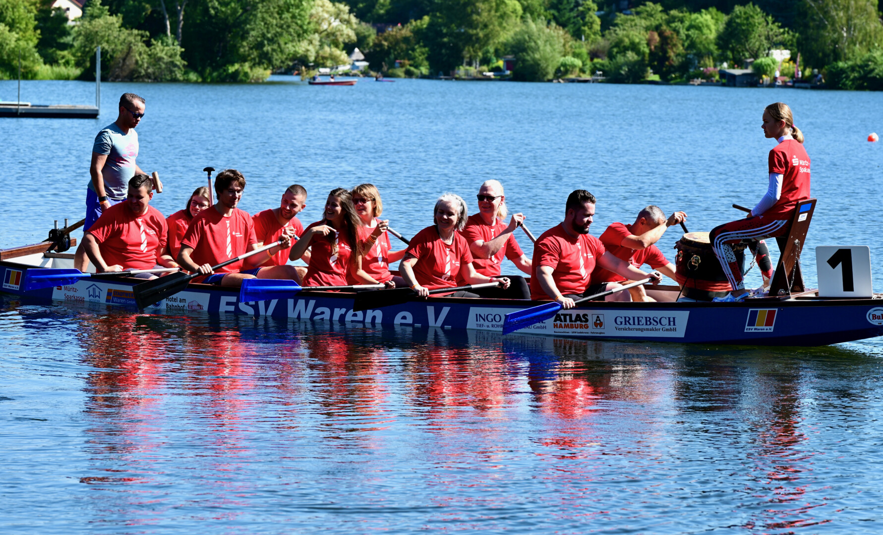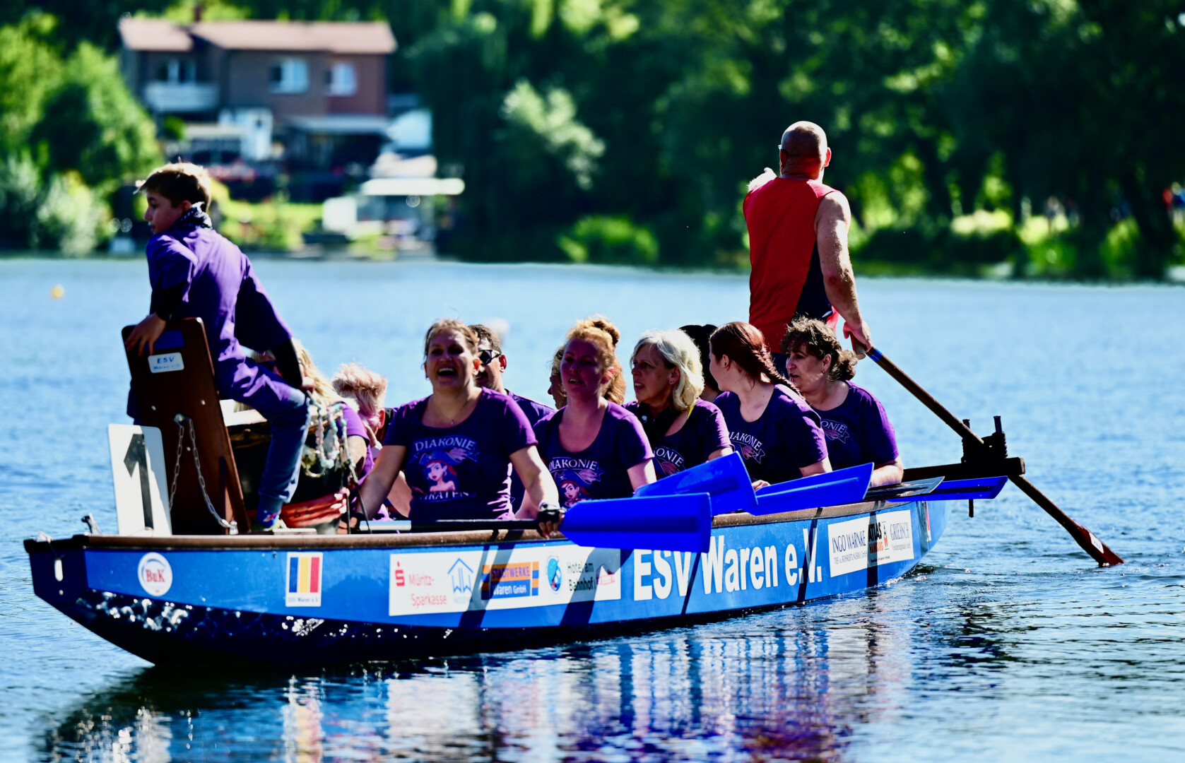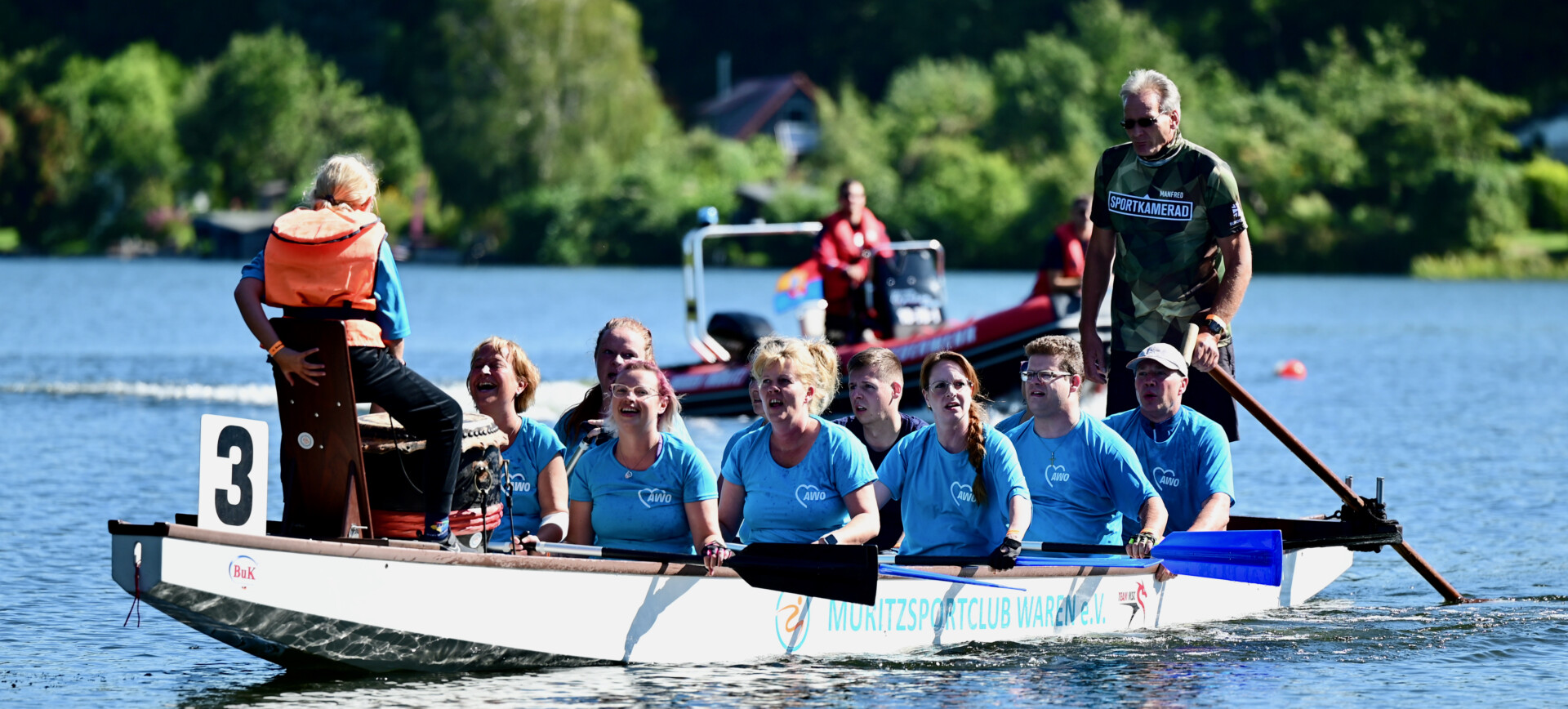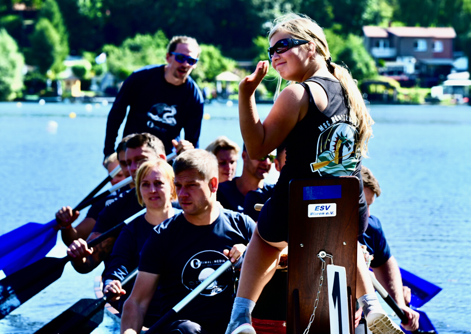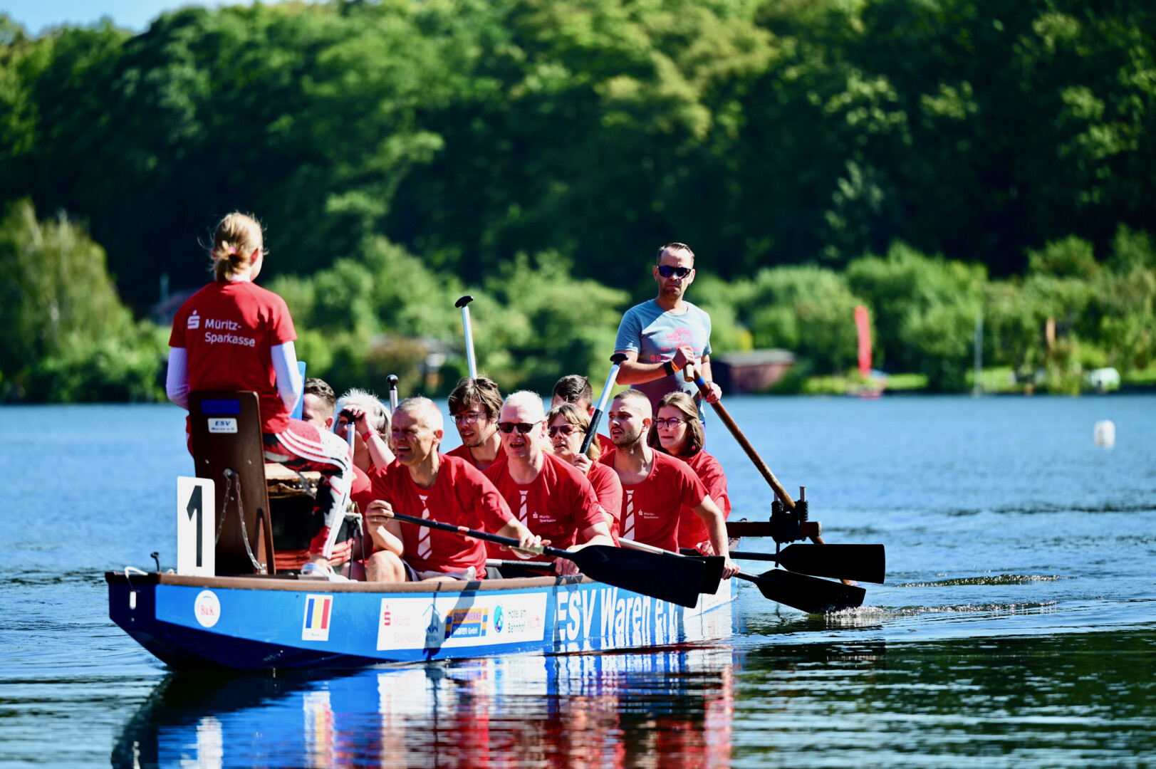 Es war wieder wie ein großes Familientreffen mit jeder Menge Spaß: Aber auch bei den 13. Stadtmeisterschaften im Drachenboot schenkten sich die 16 Teams auf dem Tiefwarensee nichts und kämpften um jede Sekunde. Da paddelten unter anderem Steuerberater gegen Tierärzte, Autohaus-Mitarbeiter gegen Pflegekräfte und Sparkassen-Mitarbeiter gegen Kurzentrum-Beschäftigte. Dabei zeigten sich die Teilnehmer schon bei der Wahl der Team-Namen sehr kreativ. Beispielsweise gleitete der „Seuchenkahn“ über den Tiefwarensee – das Boot des keislichen Veterinäramtes mit alleine sieben Tierärzten an Bord. optimal media schickte gleich zwei Mannschaften ins Rennen – angepasst an die Plattenproduktion die A-Seite und die B-Seite. Eine weiteres Team des Landkreises machte als „Amtsdrachen“ auf sich aufmerksam, die Bundeswehrleute starteten als „Die Oliven“ und die Stadtwerke Waren als „Wasser-Patscher“. Alle hatten eines gemeinsam: Ganz viel Spaß am Drachenbootfahren, am Wettkampf und an der ausgelassenen Gemeinsamkeit.