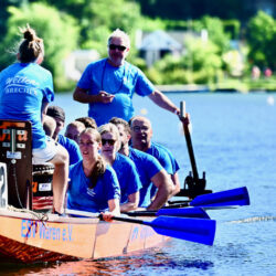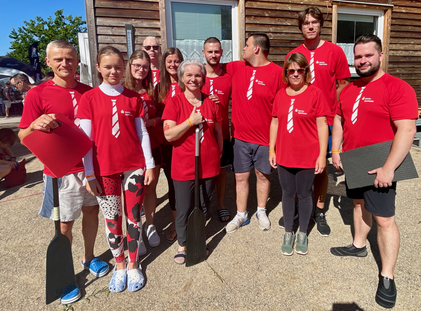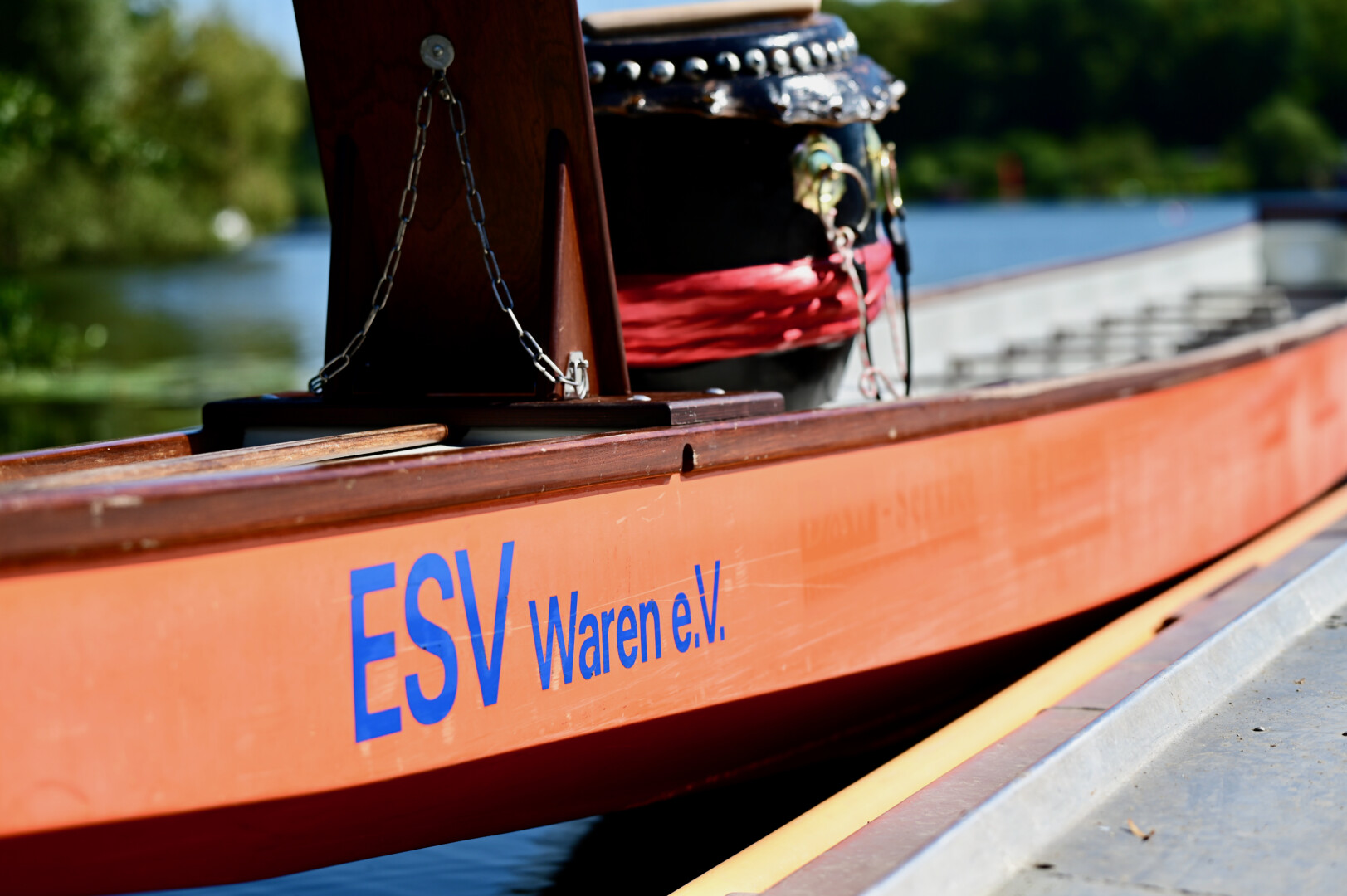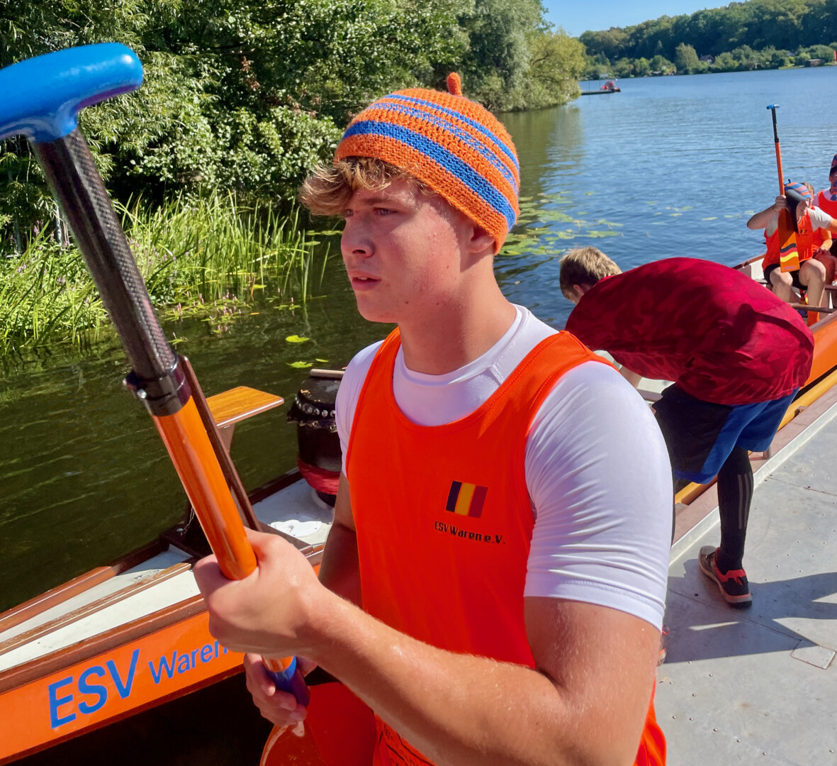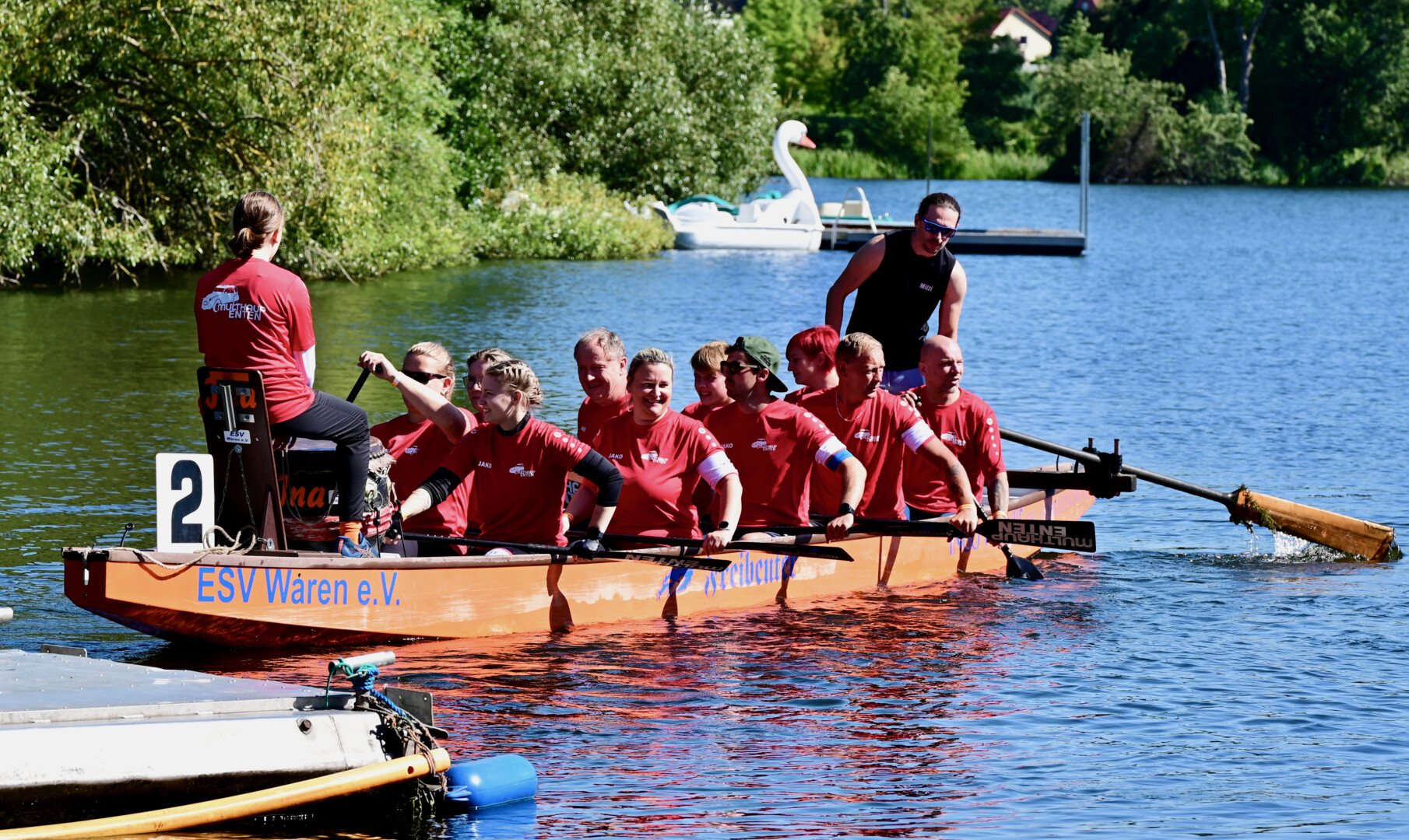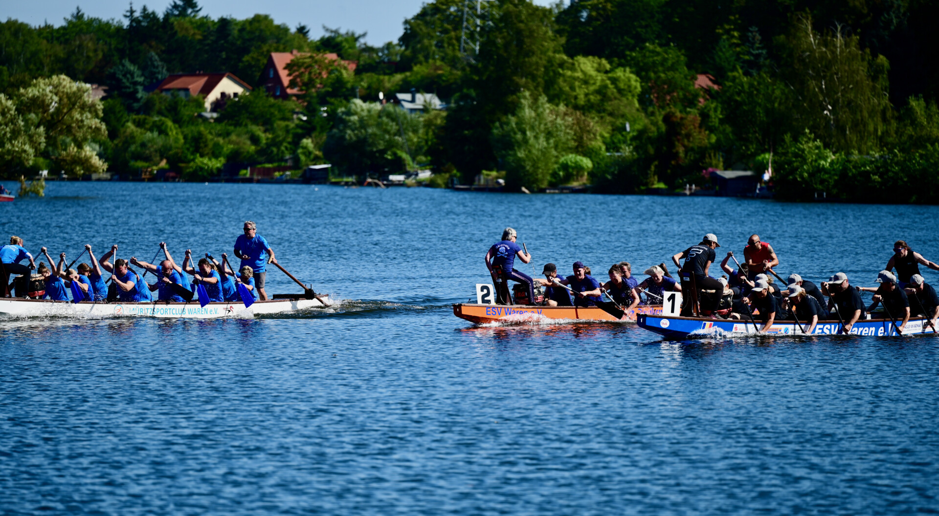 Es war wieder wie ein großes Familientreffen mit jeder Menge Spaß: Aber auch bei den 13. Stadtmeisterschaften im Drachenboot schenkten sich die 16 Teams auf dem Tiefwarensee nichts und kämpften um jede Sekunde. Da paddelten unter anderem Steuerberater gegen Tierärzte, Autohaus-Mitarbeiter gegen Pflegekräfte und Sparkassen-Mitarbeiter gegen Kurzentrum-Beschäftigte. Dabei zeigten sich die Teilnehmer schon bei der Wahl der Team-Namen sehr kreativ. Beispielsweise gleitete der „Seuchenkahn“ über den Tiefwarensee – das Boot des keislichen Veterinäramtes mit alleine sieben Tierärzten an Bord. optimal media schickte gleich zwei Mannschaften ins Rennen – angepasst an die Plattenproduktion die A-Seite und die B-Seite. Eine weiteres Team des Landkreises machte als „Amtsdrachen“ auf sich aufmerksam, die Bundeswehrleute starteten als „Die Oliven“ und die Stadtwerke Waren als „Wasser-Patscher“. Alle hatten eines gemeinsam: Ganz viel Spaß am Drachenbootfahren, am Wettkampf und an der ausgelassenen Gemeinsamkeit.