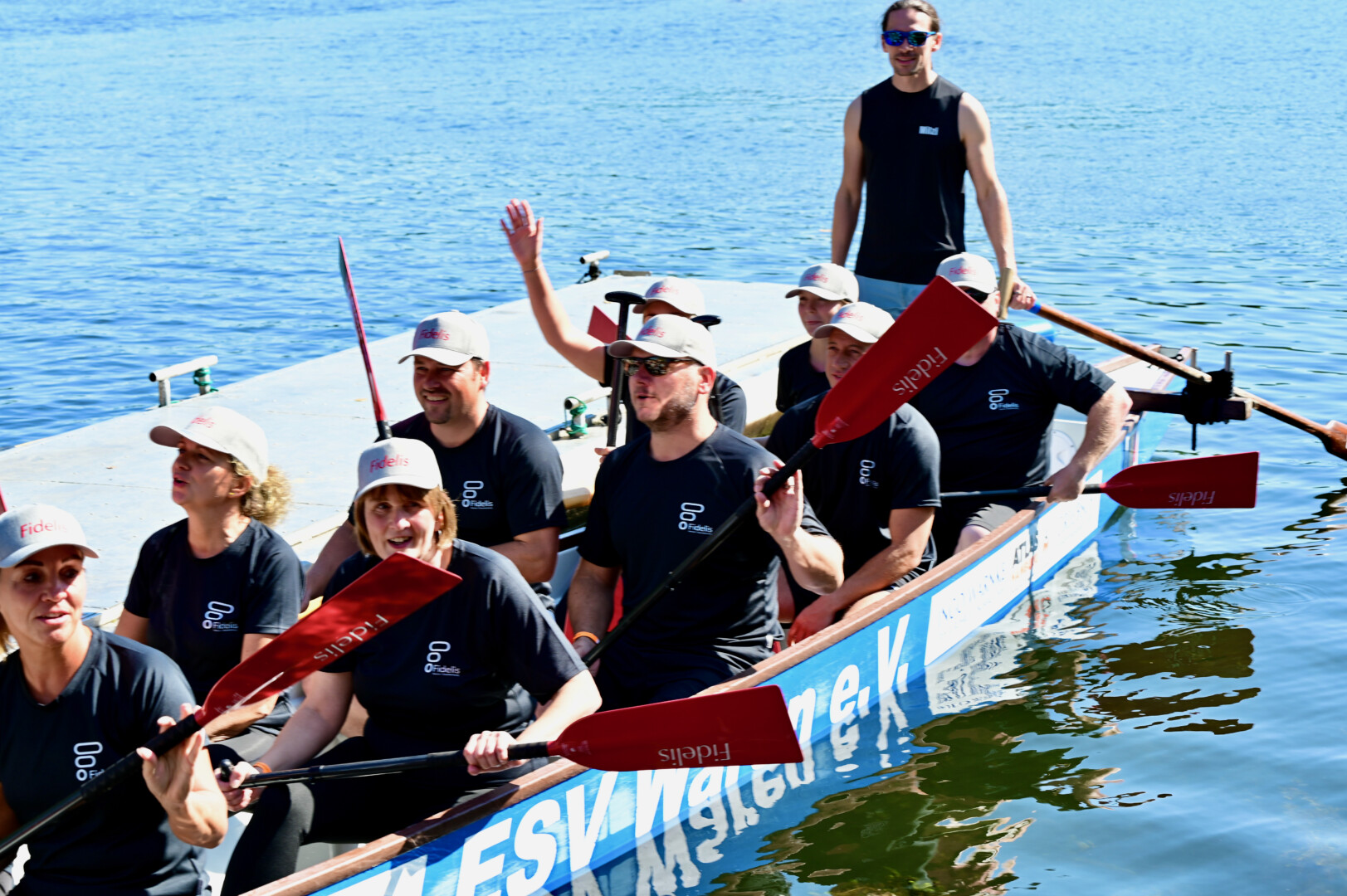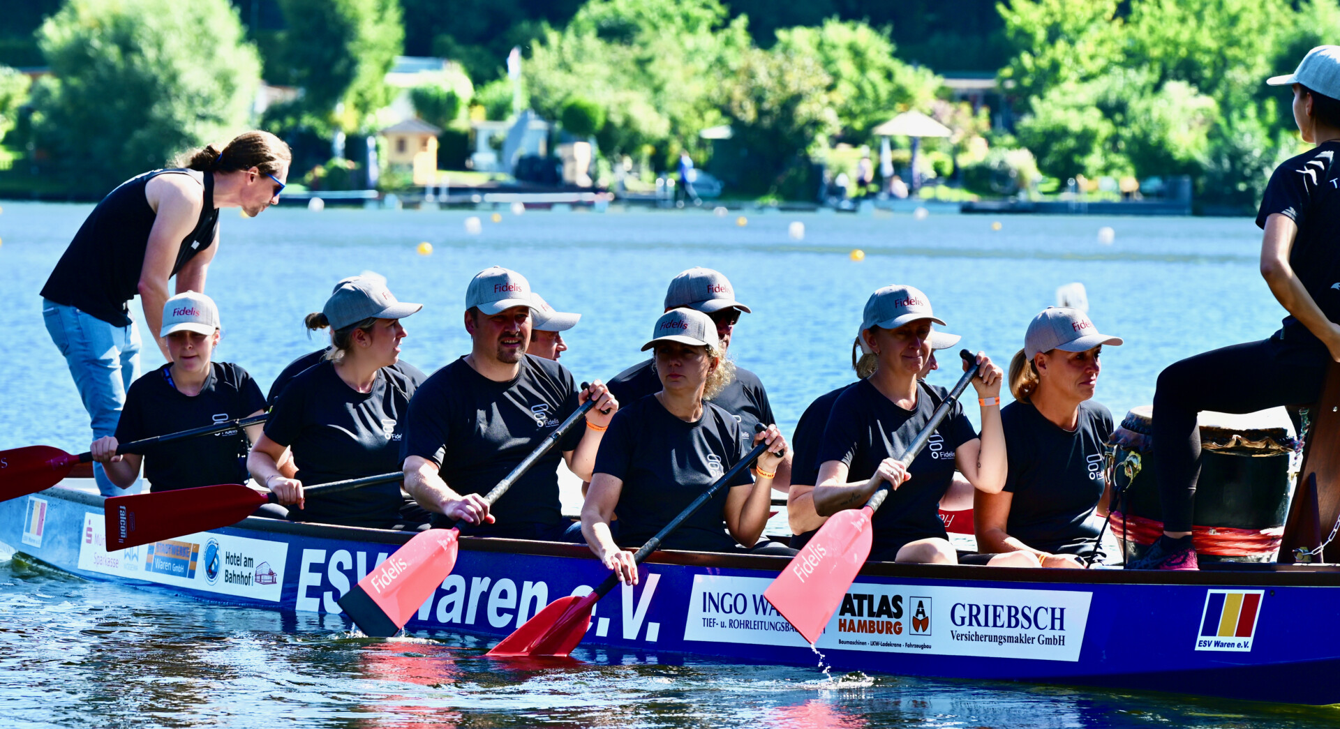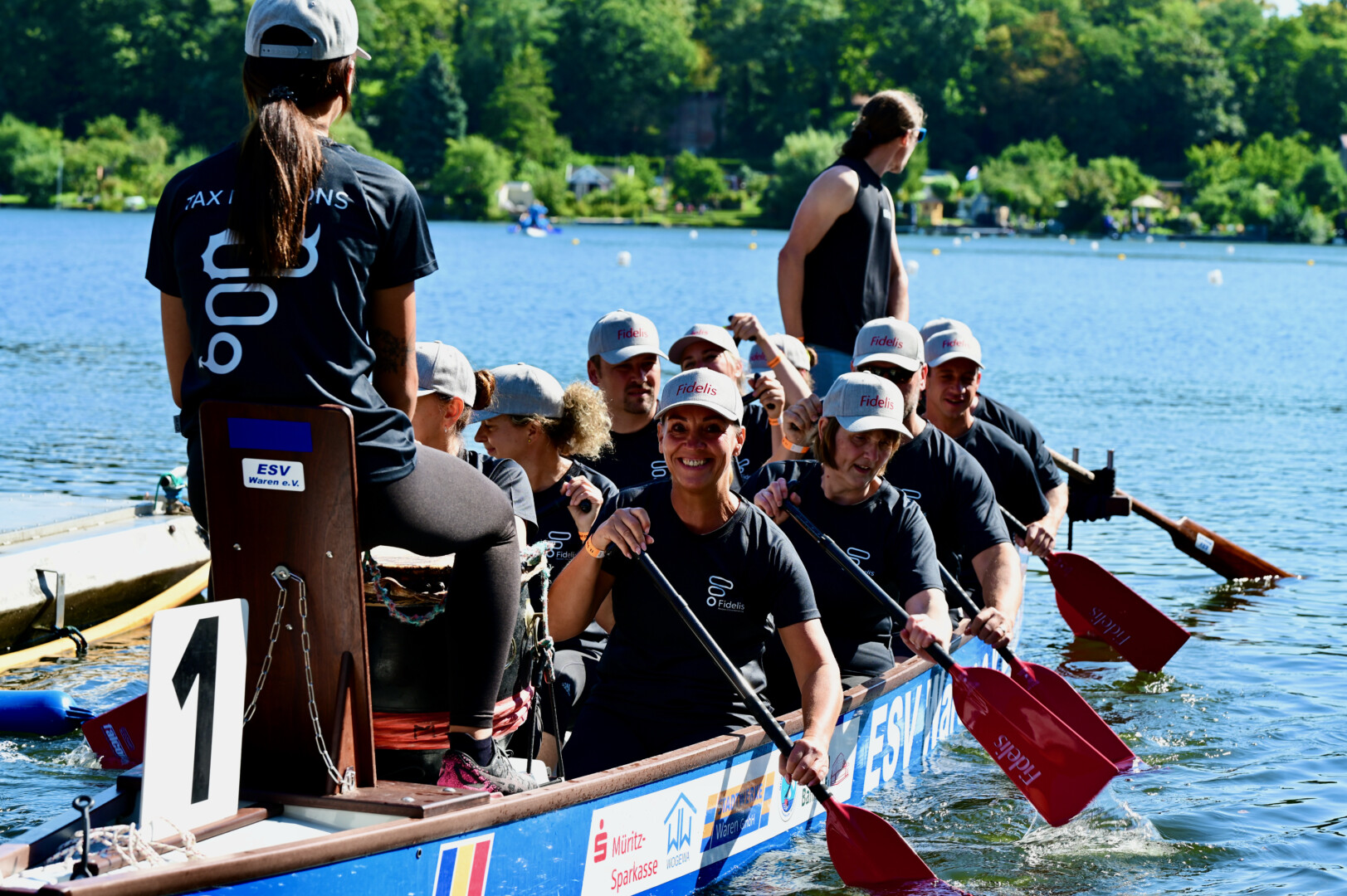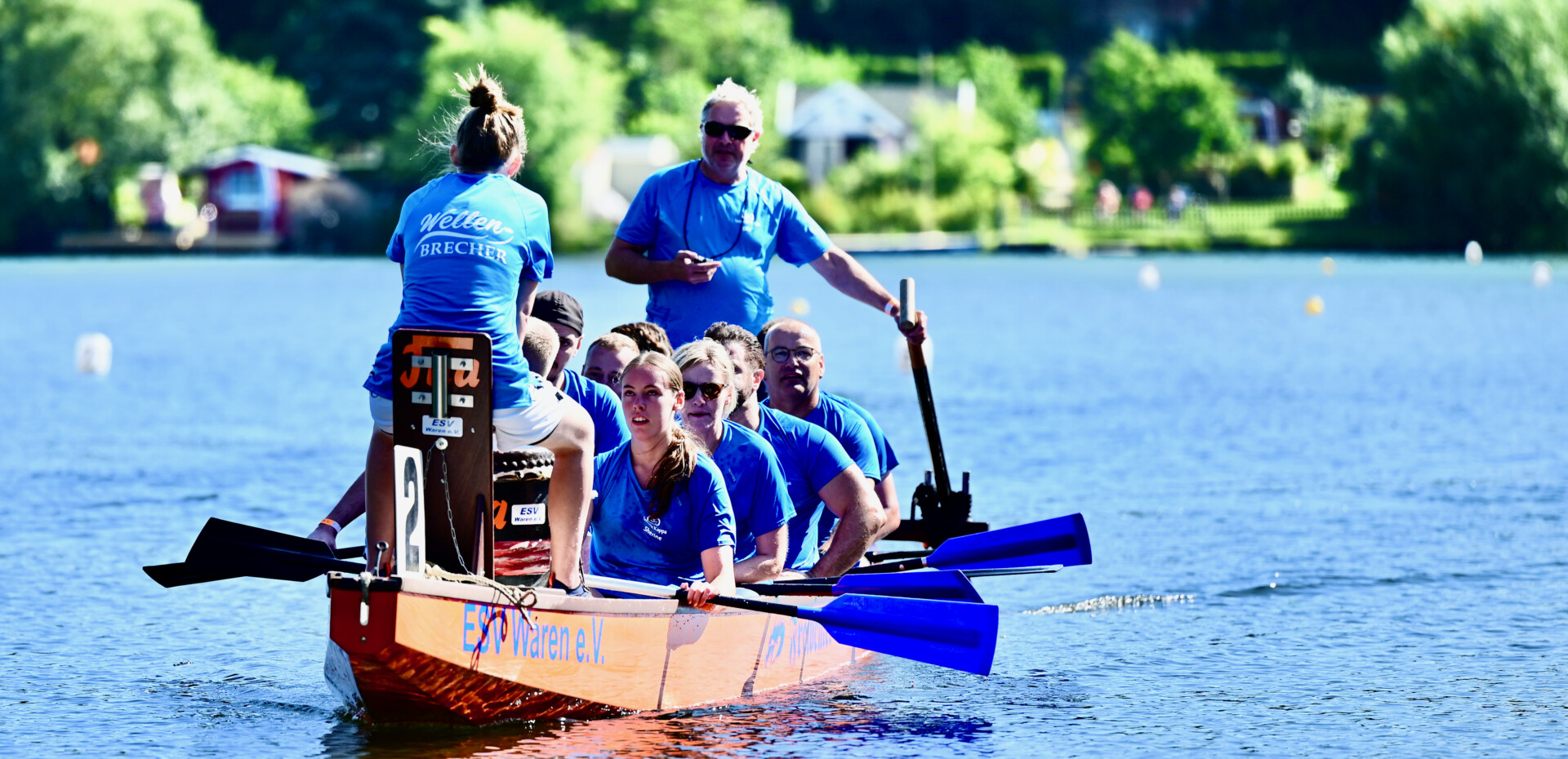 Es war wieder wie ein großes Familientreffen mit jeder Menge Spaß: Aber auch bei den 13. Stadtmeisterschaften im Drachenboot schenkten sich die 16 Teams auf dem Tiefwarensee nichts und kämpften um jede Sekunde. Da paddelten unter anderem Steuerberater gegen Tierärzte, Autohaus-Mitarbeiter gegen Pflegekräfte und Sparkassen-Mitarbeiter gegen Kurzentrum-Beschäftigte. Dabei zeigten sich die Teilnehmer schon bei der Wahl der Team-Namen sehr kreativ. Beispielsweise gleitete der „Seuchenkahn“ über den Tiefwarensee – das Boot des keislichen Veterinäramtes mit alleine sieben Tierärzten an Bord. optimal media schickte gleich zwei Mannschaften ins Rennen – angepasst an die Plattenproduktion die A-Seite und die B-Seite. Eine weiteres Team des Landkreises machte als „Amtsdrachen“ auf sich aufmerksam, die Bundeswehrleute starteten als „Die Oliven“ und die Stadtwerke Waren als „Wasser-Patscher“. Alle hatten eines gemeinsam: Ganz viel Spaß am Drachenbootfahren, am Wettkampf und an der ausgelassenen Gemeinsamkeit.