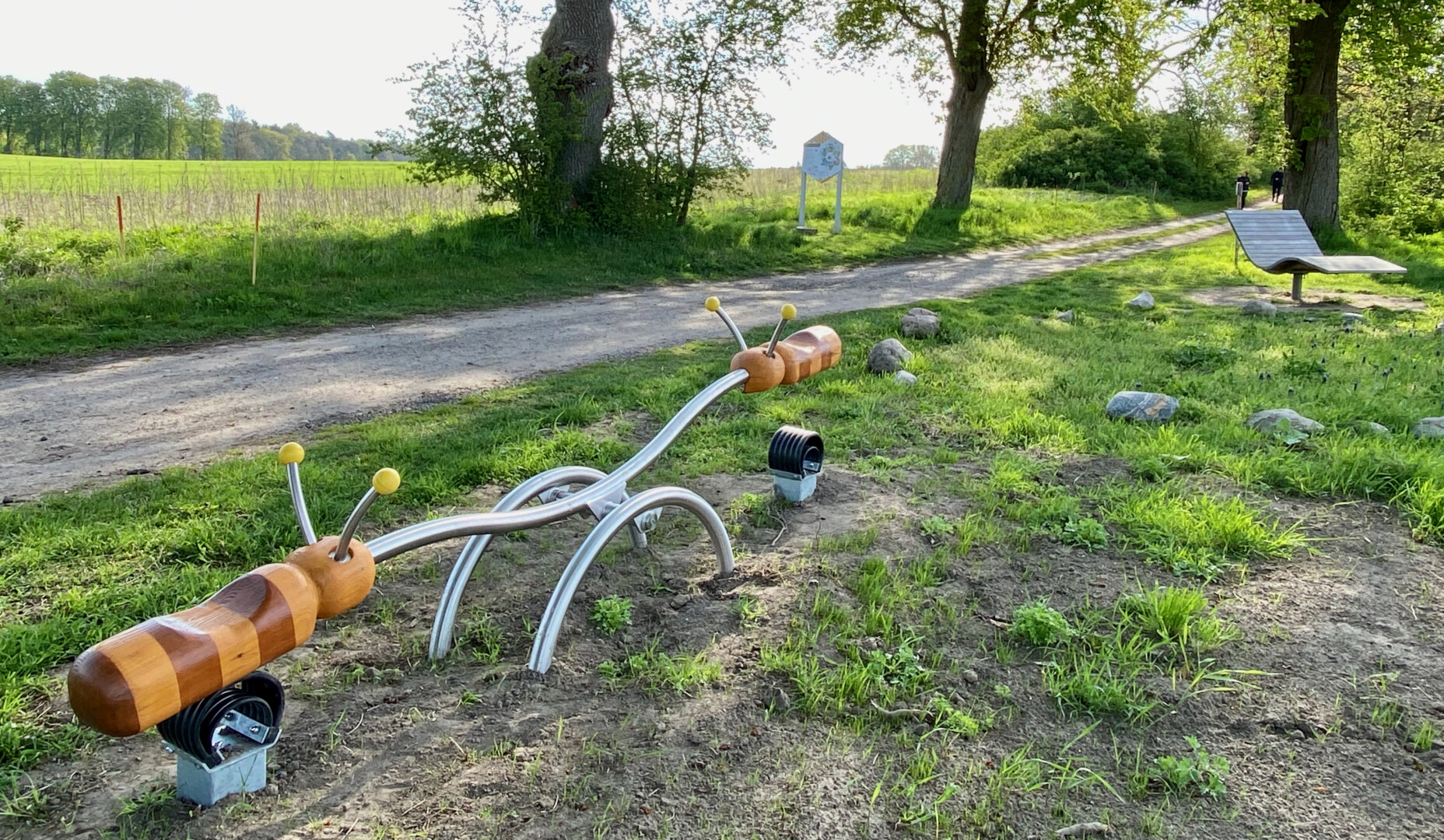Vier Bewegungselemente entlang des Bienenlehrpfades laden kleine und große Kinder ein, den Pfad tobend zu erkunden. Mit dabei sind eine Bienen-Wippe für zwei, ein Blumen-Karussell, zwei unterschiedlich hohe Reckstangen und eine Blumenfeder-Wippe. Neben all dem Bienen-Wissen, das sich auf den elf Infotafeln befindet, wurde der Lehrpfad also um eine weitere Möglichkeit ergänzt, spielend die Welt zu entdecken und Zusammenhänge zu begreifen.