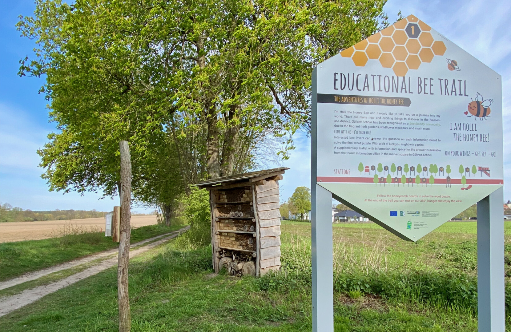 Und so reifte die Idee, einen Bienenlehrpfad einzurichten. Mit Hilfe des Preisgeldes, einer Förderung durch das Leader-Programm und der Hilfe von Unternehmen, der Gemeinde sowie privaten Unterstützern legte das Team der Kur- und Tourismus GmbH los. Am kaum befahrenen Landwirtschaftsweg zwischen Göhren-Lebbin und Kirch Poppentin, der alleine schon durch seine urigen Kastanien einen Besuch wert ist, entstand ein Bienenlehrpfad, der kleinen und großen Spaziergängern viel Wissenswertes vermittelt.