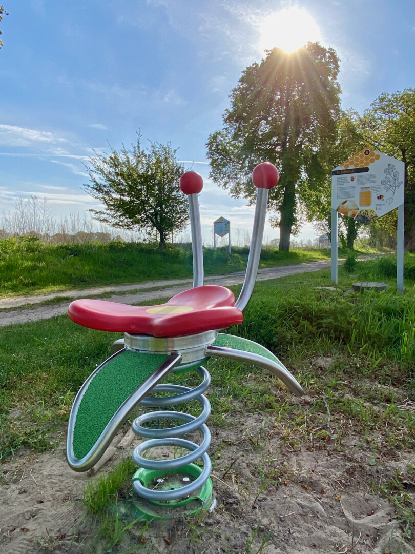 Vier Bewegungselemente entlang des Bienenlehrpfades laden kleine und große Kinder ein, den Pfad tobend zu erkunden. Mit dabei sind eine Bienen-Wippe für zwei, ein Blumen-Karussell, zwei unterschiedlich hohe Reckstangen und eine Blumenfeder-Wippe. Neben all dem Bienen-Wissen, das sich auf den elf Infotafeln befindet, wurde der Lehrpfad also um eine weitere Möglichkeit ergänzt, spielend die Welt zu entdecken und Zusammenhänge zu begreifen.