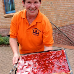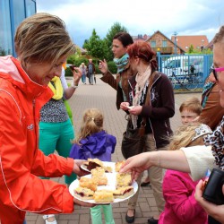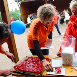 Das machen die WOGEWA-Leute natürlich nicht monatlich, aber einmal im Jahr, wenn sie zum Mieterfest einladen, wollen sie ihren Gästen auch etwas bieten. So waren die Bleche mit dem leckeren Erdbeerkuchen auch innerhalb kürzester Zeit ratzekahl leergeputzt, und auch vom andere Kuchen blieben nur ein paar Krümel übrig.