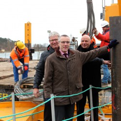 Ramm2Der erste ist versenkt. Zumindest fast. Fehlen also „nur noch“ 179 Pfähle mit einer Länge von 20 bis 40 Metern. Denn so viele Eisenpfeiler müssen in den Untergrund gerammt werden, um die neue Nord- und Südmole am Warener Hafen zu bauen. Bürgermeister Norbert Möller gab heute den Startschuss fürs Rammen, das eigentlich eher rütteln heißen müsste.