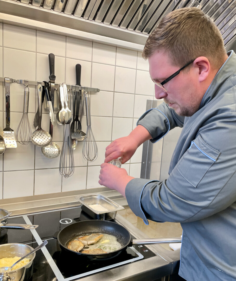 Die leckeren Torten aus der eigenen Konditorei im Café des Hotels am Tiefwarensee sind schon lange ein leckerer Geheim-Tipp in der Region. Noch dazu, wenn man beim genüsslichen Schlemmen über den Tiefwarensee auf die Warener Altstadt-Silhouette blickt. Doch auch abends lässt sich im Restaurant des Hotels fürstlich speisen. „Frisch, regional und saisonal“, so beschreibt Chefkoch Marcel Lindow die Ausrichtung der Küche. Die Zutaten kommen fast ausnahmslos aus der Region, in der Saison sogar aus der eigenen Schwenziner Gärtnerei des Lebenshilfswerkes, das auch Betreiber des Hotels ist. „Wir versuchen, wirklich nur die Lebensmittel zu verwenden, die gerade Saison haben. Warum sollen wir im Winter Spargel und Co. anbieten“, so Marcel Lindow, der in dieser Woche beispielsweise gebratenes Filet vom Skrei – auch Winterkabeljau genannt – mit Roter Beete und Rosenkohl serviert.