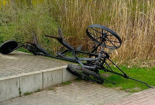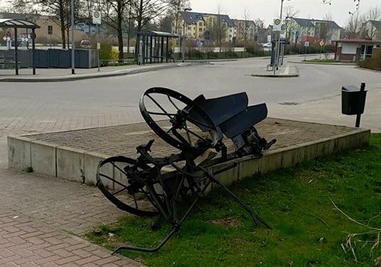 Dann liegen auch schon mal Ausstellungsstücke wie dieses aus dem Agrarhistorischen Museum Alt Schwerin, das am Warener Busbahnhof für das Museum wirbt, in der Gegend rum.