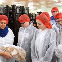 Highlight des Tages war der Besuch in der Produktion. Mit vorschriftsmäßiger Schutzbekleidung ausgestattet, verschafften sie sich einen Überblick, wie das Arbeiten in einer Bäckerei aussieht. Für wen das jedoch nicht das „Wahre“ war, der konnte sich genauso gut die Verwaltungsräume anschauen, wo die Schüler sich eine Vorstellung vom „Büroleben“ erhielten.