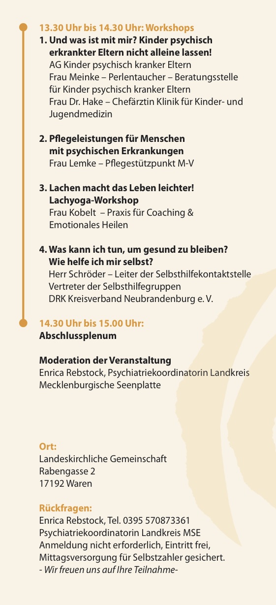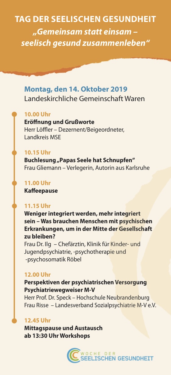 „Wir wollen allen Interessierten ein Forum bieten, sich mit dem Thema des seelischen und körperlichen Wohlbefindens auseinanderzusetzen. Denn nicht nur das körperliche, sondern auch das seelische Wohlbefinden beeinflusst die Lebensqualität eines jeden Einzelnen entscheidend. Wir wollen Aufklärung leisten, Ängste nehmen und Hilfestrategien für psychische Erkrankungen aufzeigen,“ sagt Enrica Rebstock, Psychiatriekoordinatorin des Landkreises Mecklenburgische Seenplatte.