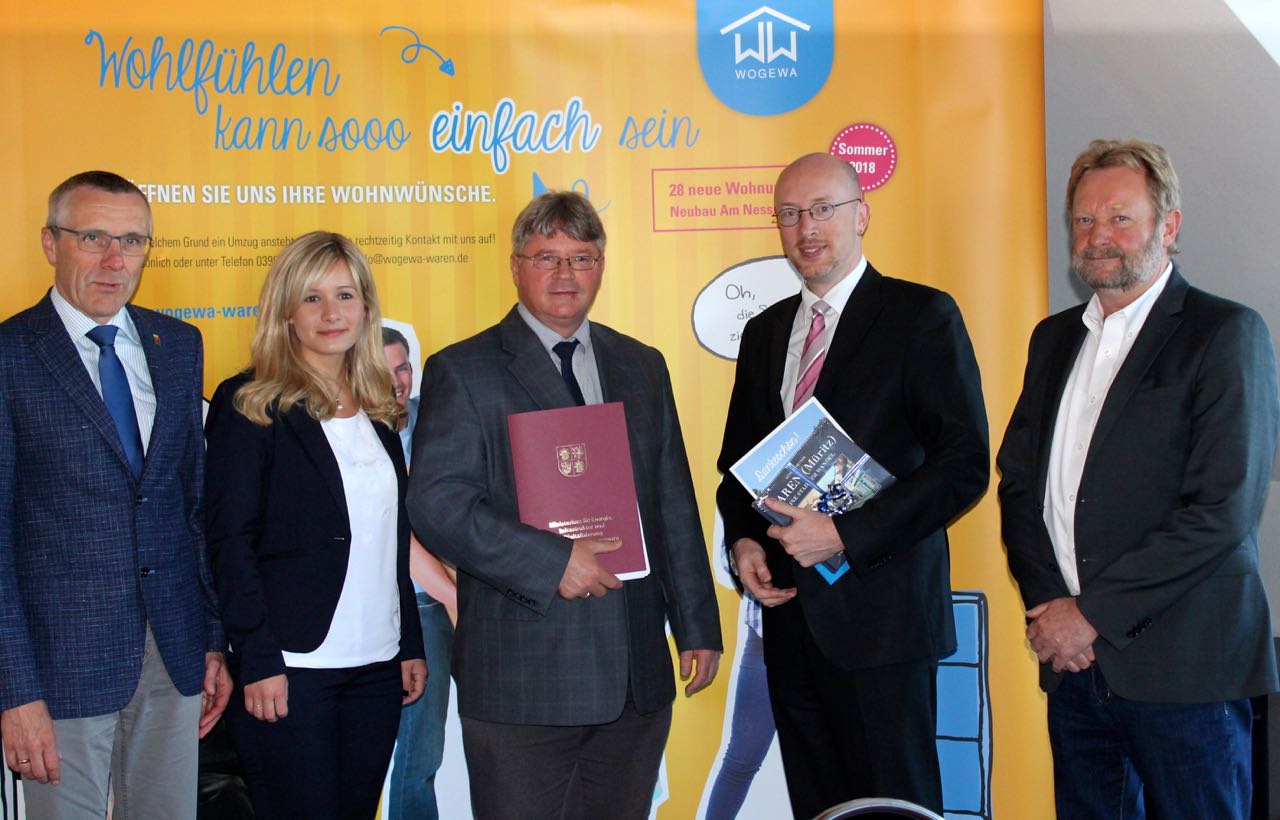 Das Geld ist da, jetzt kann es in die Vollen gehen: Infrastrukturminister Christian Pegel hat heute den ersehnten Fördermittel-Check für den Bau von neuen Wohnungen am Nesselberg an WOGEWA-Geschäftsführer Martin Wiechers übergeben. Die Erdarbeiten laufen bereits, schon im Sommer des kommenden Jahres sollen die ersten Mieter einziehen.