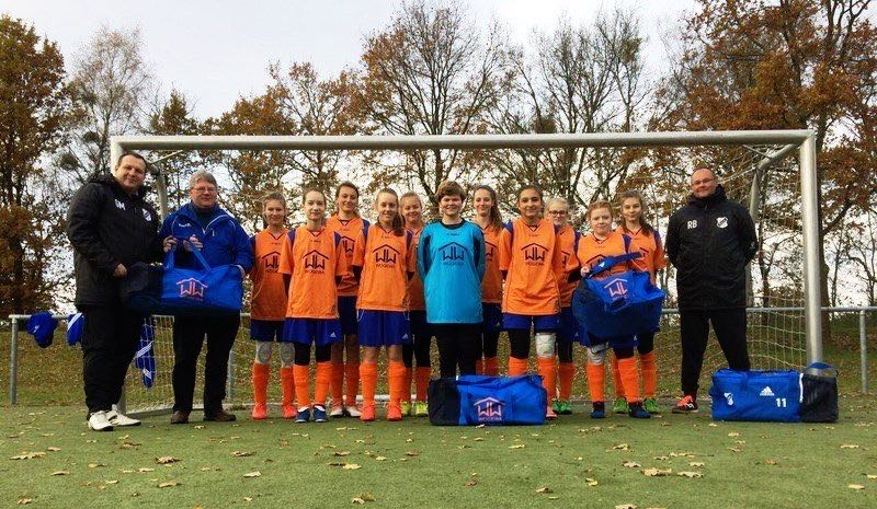 Strahlende Gesichter bei den Fußball-Mädels des SV Waren 09: Vor ihrem 5. Spieltag in der B-Juniorinnen Verbandsliga M/V übergab Wogewa-Geschäftsführer Martin Wiechers am Wochenende neue Sporttaschen.