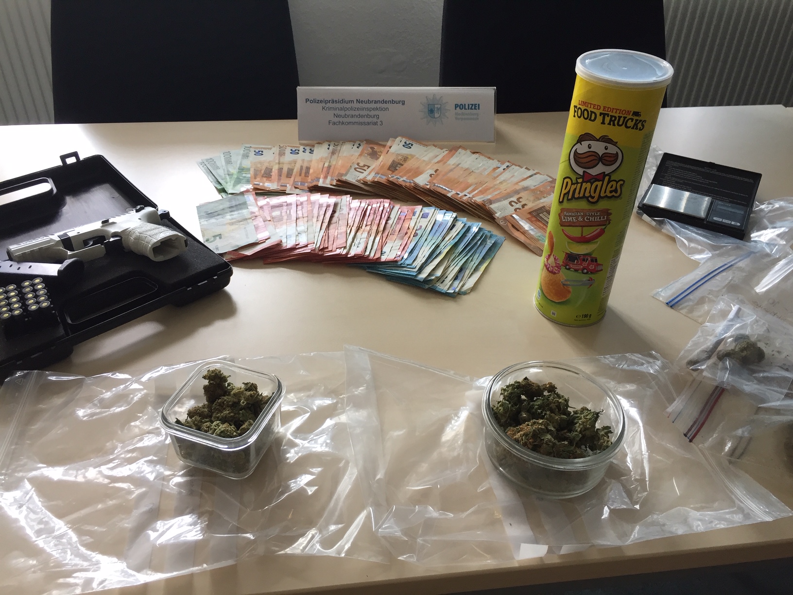 Bei der 29-jährigen Tatverdächtigen und dem zwei Jahre jüngeren Tatverdächtigen wurde eine nicht geringe Menge von unter anderem Marihuana und Amphetaminen sichergestellt. Außerdem fanden die Ermittler rund 12.000 Bargeld, das szenetypisch gestückelt ist. Sichergestellt wurde außerdem eine Schreckschusspistole und Verpackungsmaterial, das auf professionellen Drogenhandel schließen lässt.
