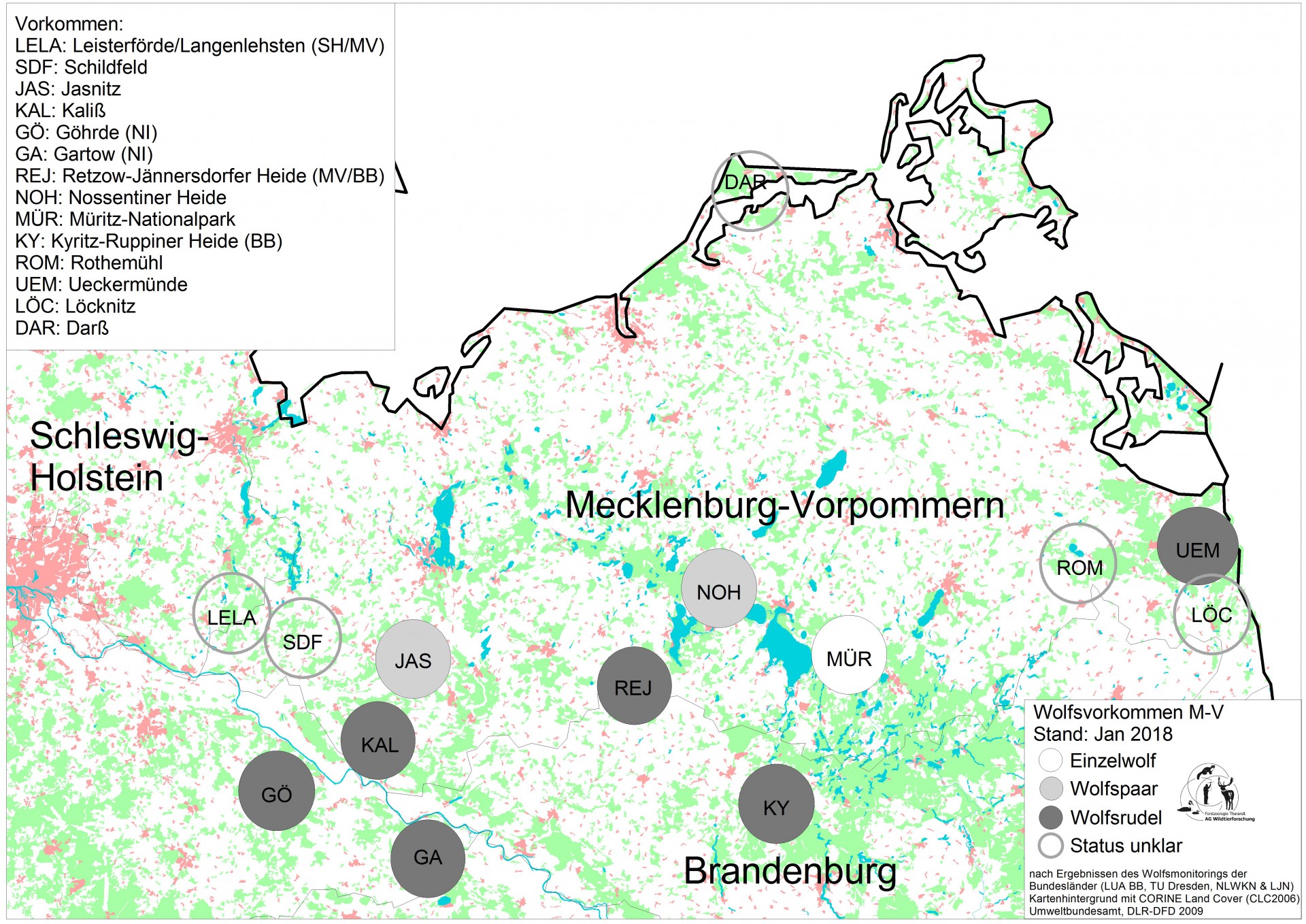 Über die genannten Rudelterritorien hinaus können für Mecklenburg-Vorpommern zwei Wolfspaare und ein residenter Einzelwolf bestätigt werden. Die Karte zeigt die aktuell bekannten Wolfsvorkommen in Mecklenburg-Vorpommern sowie weitere Vorkommen in den angrenzenden Regionen der Länder Brandenburg und Niedersachsen.