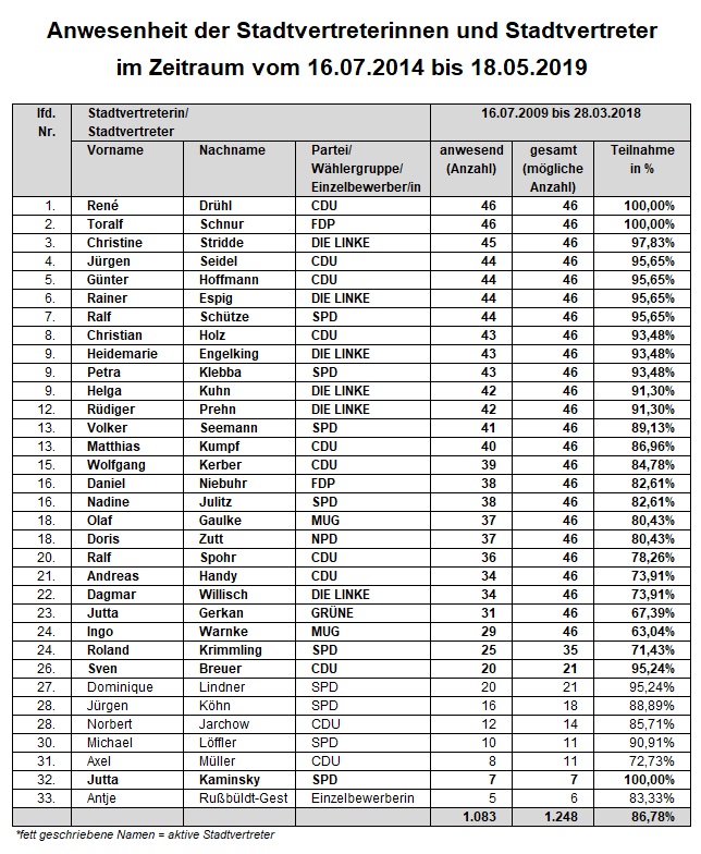 Ich bin wirklich immer wieder erstaunt, dass es Stadtvertreter gibt, die es geschafft haben, nahezu nie etwas in den Sitzungen zu sagen. Absoluter Rekordhalter ist hier bspw. Dominique Lindner (SPD), der in keiner seiner 20 Sitzungen jemals etwas gesagt hat. Dicht gefolgt von, Günter Hoffmann (CDU) und Roland Krimmling (SPD).
