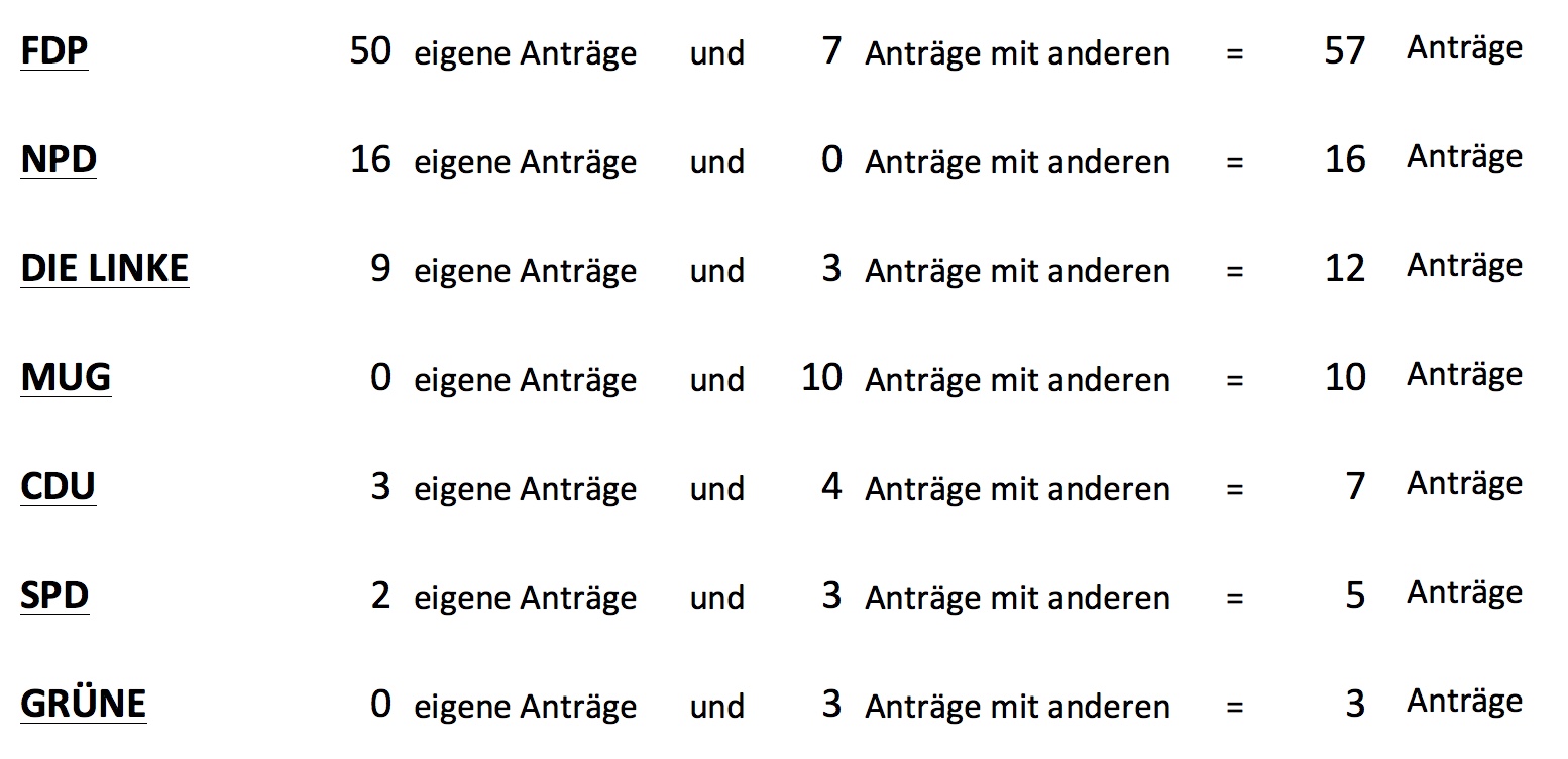 Es sind genau 50 Anträge, die wir allein gestellt haben und 7 weitere mit anderen zusammen. Eine Mehrheit davon haben wir zwar nur in 24 Fällen bekommen, aber das ist zu früher, wo noch etwas mehr als 75 Prozent unserer Anträge abgelehnt wurden, fast schon ein Quantensprung und lässt für die Zukunft hoffen.