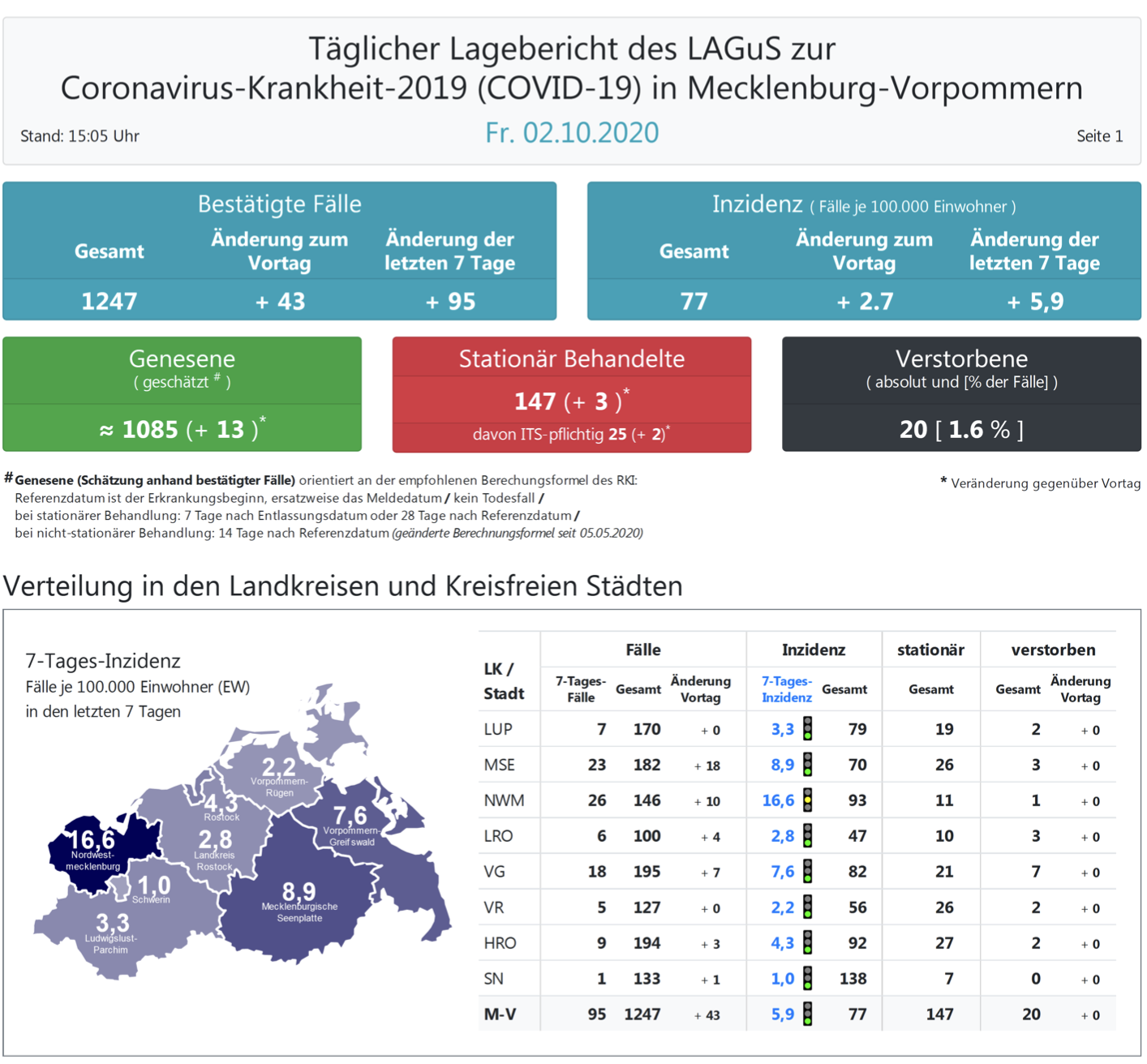 Bis heute 15 Uhr wurden in Mecklenburg-Vorpommern 43 neue Corona-Infektionen aus fast allen Landkreisen und kreisfreien Städten gemeldet, 18 davon aus dem Landkreis Mecklenburgische Seenplatte. Die vergleichsweise hohe Fallzahl – zuletzt ähnlich hoch am 31. März 2020 mit 46 Fällen – ist auf verschiedene Ausbrüche infolge von Familienfeierlichkeiten (z. B. Geburtstage, Kommunion) sowie eine Vielzahl von Reiserückkehrern bzw. auf Infektionen durch Aufenthalt in anderen Bundesländern zurückzuführen.