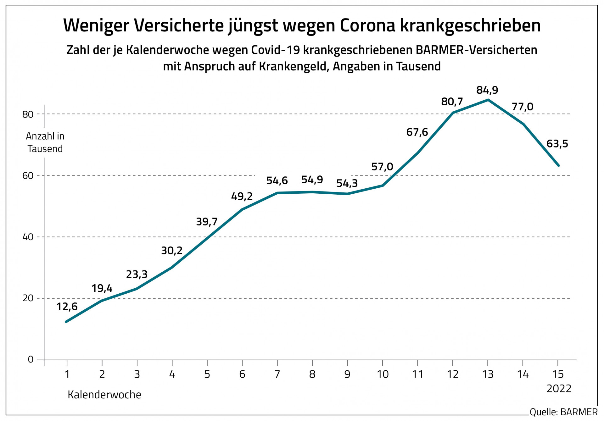 Erstmals in diesem Jahr ist die Zahl der Corona-bedingten Krankschreibungen deutlich rückläufig. Das geht aus einer aktuellen Auswertung des BARMER Instituts für Gesundheitssystemforschung (bifg) unter BARMER-versicherten Erwerbstätigen hervor. Demnach waren in der Woche vom 10. bis 16. April rund 63.500 Versicherte mit Anspruch auf Krankengeld wegen einer Covid-19-Infektion arbeitsunfähig. Zwei Wochen zuvor waren es auf dem Höhepunkt noch etwa 84.900 Betroffene. Das entspricht einem Rückgang um rund 25 Prozent. Seit Beginn des Jahres war die Zahl der Krankschreibungen, abgesehen von einem minimalen Rückgang um ein Prozent Anfang März, stets gestiegen.
