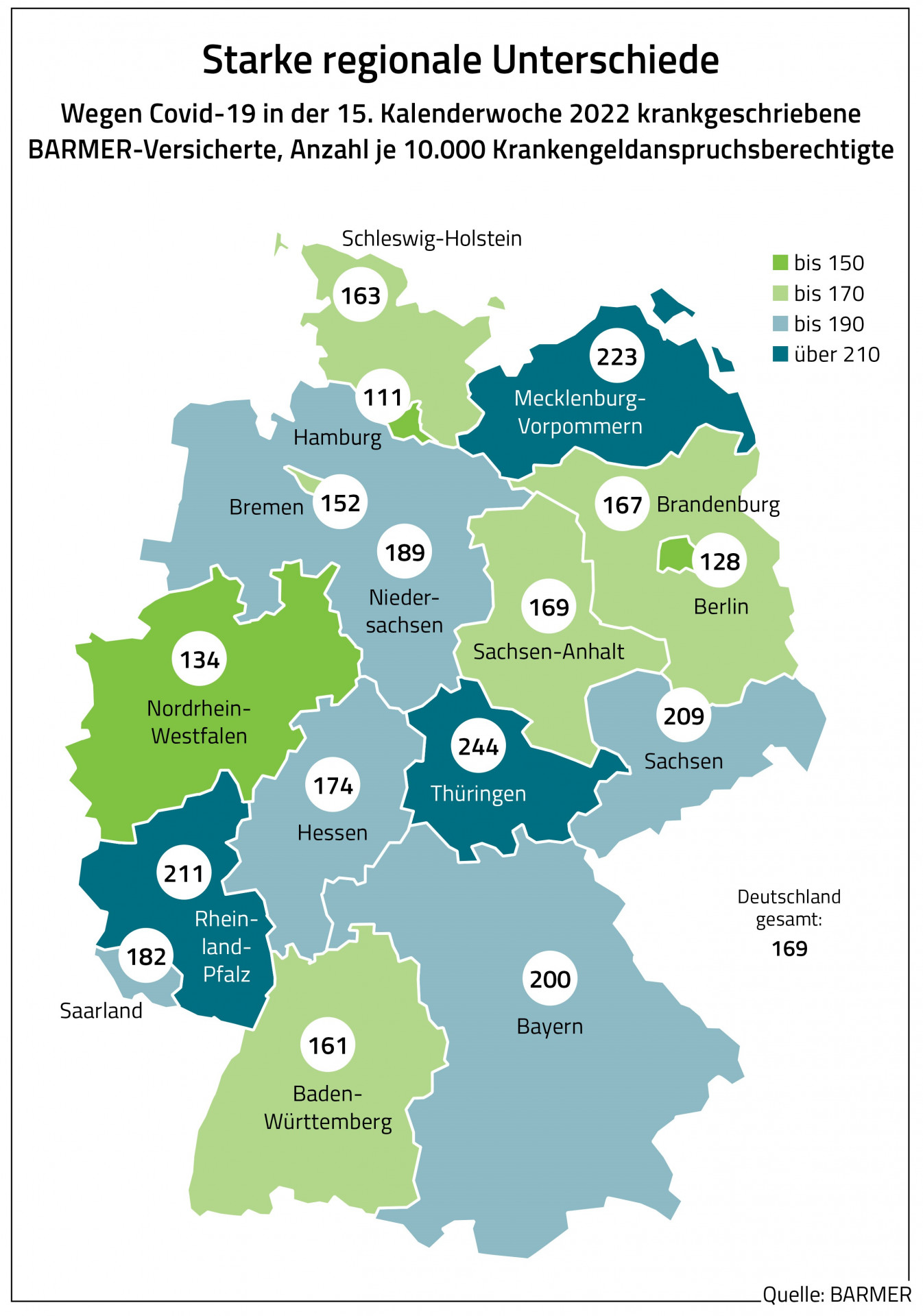 Auf Platz zwei und drei befanden sich Mecklenburg-Vorpommern und Rheinland-Pfalz mit 223 beziehungsweise 211 Betroffenen je 10.000 Anspruchsberechtigten, die aufgrund einer Corona-Infektion krankgeschrieben waren. Hamburg bildete das Schlusslicht mit 111 Krankgeschriebenen je 10.000 Anspruchsberechtigten.