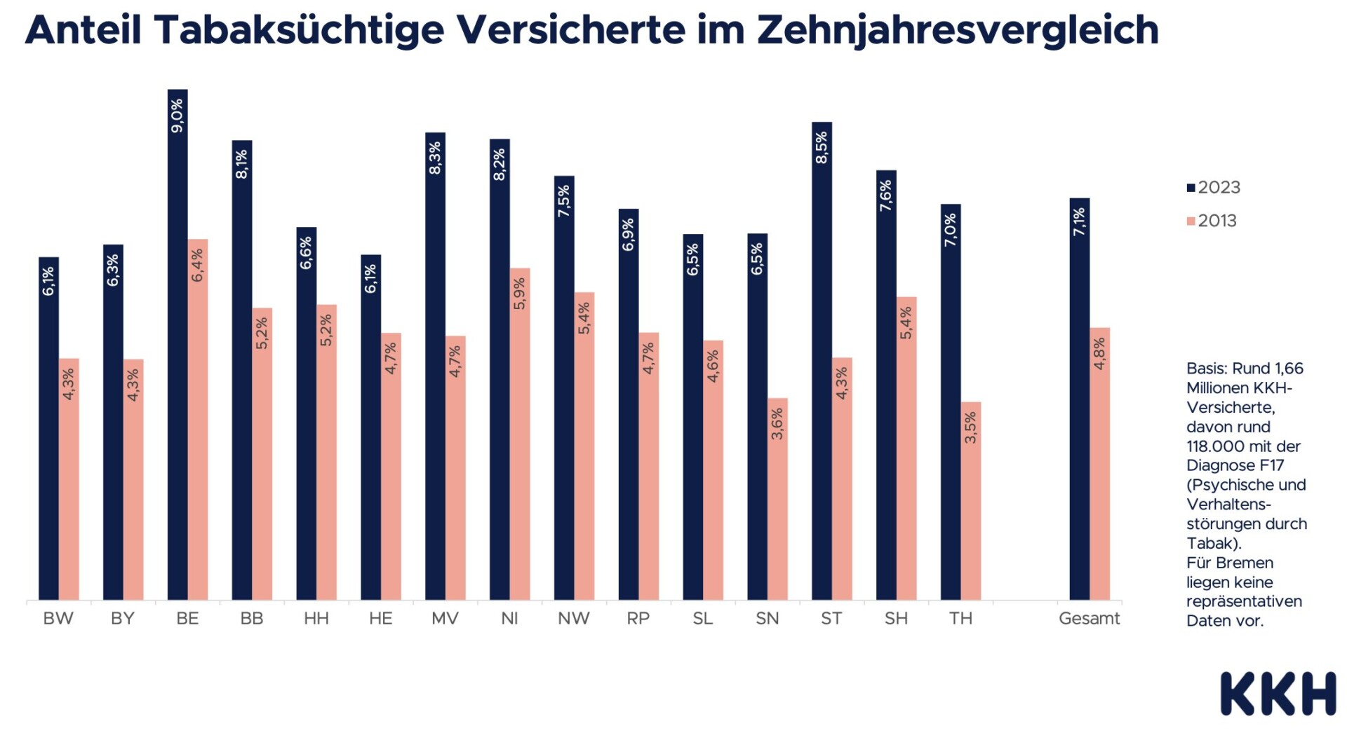 Am kritischsten ist die Lage in Thüringen: Dort stieg die Zahl der Tabaksüchtigen im Zehnjahresvergleich auf das Doppelte an (99,6 Prozent). Das geringste Plus verzeichnet die KKH hingegen mit rund 26 Prozent in Hamburg. Der Bundesdurchschnitt liegt bei 47,5 Prozent. Der größte Anteil an COPD-erkrankten Starkrauchern lebt wiederum im Saarland (26,1 Prozent im aktuellsten Auswertungsjahr 2023). Das deutschlandweite Mittel liegt bei 19,5 Prozent.