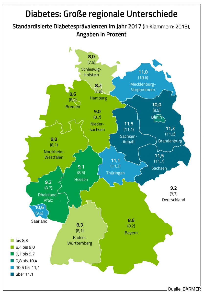 Laut „Diabetes-Atlas“ gab es im Jahr 2017 die höchsten Diabetesraten in Sachsen und Sachsen-Anhalt mit jeweils 11,5 Prozent, Brandenburg (11,3 Prozent), Thüringen (11,1 Prozent) und Mecklenburg-Vorpommern (elf Prozent). Die geringsten Quoten lagen in Schleswig-Holstein (acht Prozent) und Hamburg (8,2 Prozent) vor. „Die regionalen Schwankungen bei den Diabetesraten sind nicht auf unterschiedliche Alters- oder Geschlechtsstrukturen zurückführen“, so Straub.