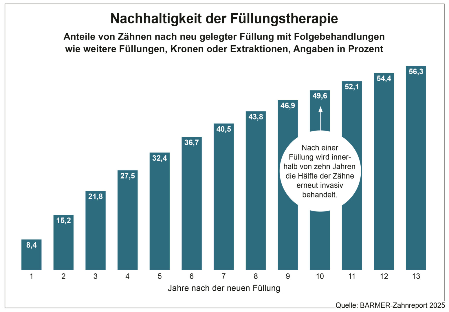Barmer-Chef Straub sprach sich dafür aus, die anstelle von Amalgam eingesetzten Alternativwerkstoffe durch weitere Studien wissenschaftlich optimal abzusichern. „Da die Ästhetik der in der Regel zahnfarbenen Amalgamalternativen immer besser wird, ist bereits in absehbarer Zeit eine größere Nachfrage nach diesen zuzahlungsfreien Füllungen zu erwarten. Es bedarf daher weiterer Forschung, um den Versicherten in Sachen Haltbarkeit auch künftig die bestmögliche Versorgung anbieten zu können.“ Für den Zahnreport wurden Abrechnungsdaten von insgesamt 13,6 Millionen Versicherten über einen Zeitraum von bis zu dreizehn Jahren wissenschaftlich analysiert.