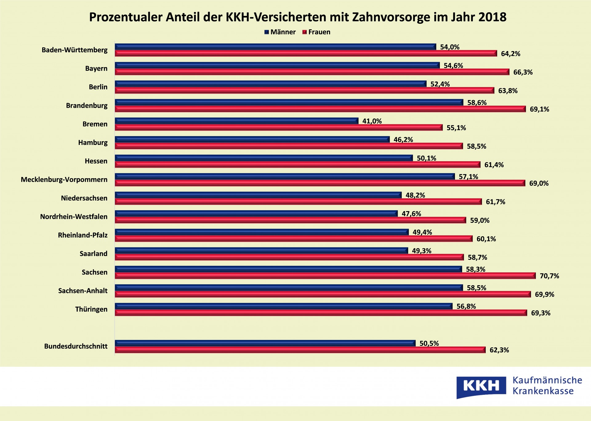 Der Bundesländervergleich zeigt darüber hinaus, dass die Frauen in allen Regionen Deutschlands gewissenhafter mit ihrer Zahngesundheit umgehen als die Männer – vor allem im Osten der Republik. Auf Platz eins liegen Sachsens Frauen mit 70,7 Prozent, gefolgt von Sachsen-Anhalts, Thüringens, Brandenburgs und Mecklenburg-Vorpommerns Frauen. Schlusslicht sind Bremens Männer mit einer Vorsorgequote von nur 41 Prozent. Im Bundesdurchschnitt gehen 62,3 Prozent der Frauen und 50,5 Prozent der Männer mindestens einmal jährlich zur Zahnkontrolle.