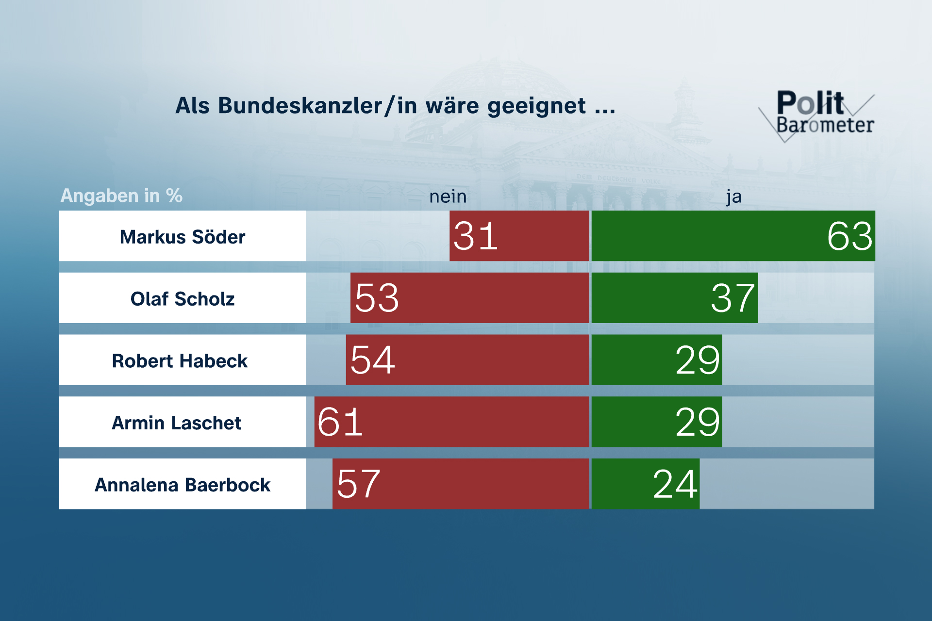 Das Rennen um die Kanzlerkandidatur bei der Union ist in der entscheidenden Phase und genau wie in den letzten Wochen hat Markus Söder auch jetzt einen klaren Vorsprung vor Armin Laschet: Den CSU-Vorsitzenden halten 63 Prozent aller Befragten und 84 Prozent der CDU/CSU-Anhänger für kanzlertauglich (nein: 31 Prozent bzw. 12 Prozent). Armin Laschet trauen das Amt nur insgesamt 29 Prozent zu und in den eigenen Reihen 43 Prozent (nein: 61 Prozent bzw. 49 Prozent; Rest zu 100 Prozent hier und im Folgenden jeweils „weiß nicht“).