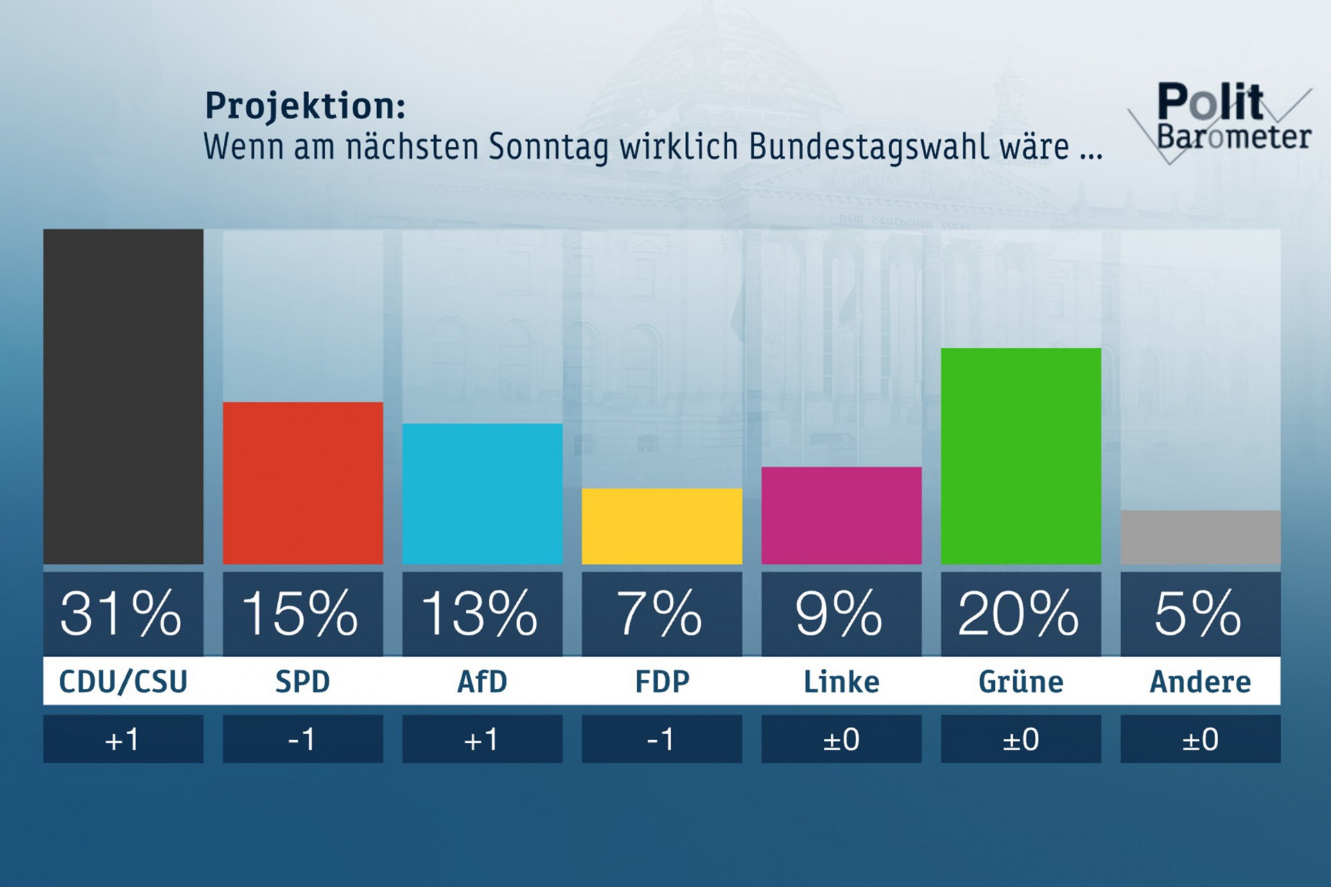 Wenn am nächsten Sonntag wirklich Bundestagswahl wäre, würde sich die Union auf 31 Prozent verbessern (plus 1) und die SPD nach ihrem Zugewinn Anfang Februar wieder auf 15 Prozent zurückgehen (minus 1). Die AfD käme auf 13 Prozent (plus 1), die FDP auf 7 Prozent (minus 1), die Linke auf 9 Prozent und die Grünen auf 20 Prozent. Die anderen Parteien zusammen lägen bei 5 Prozent (alle unverändert). Damit hätte eine Koalition aus CDU/CSU und Grünen weiterhin als einziges Zweier-Bündnis eine Mehrheit.