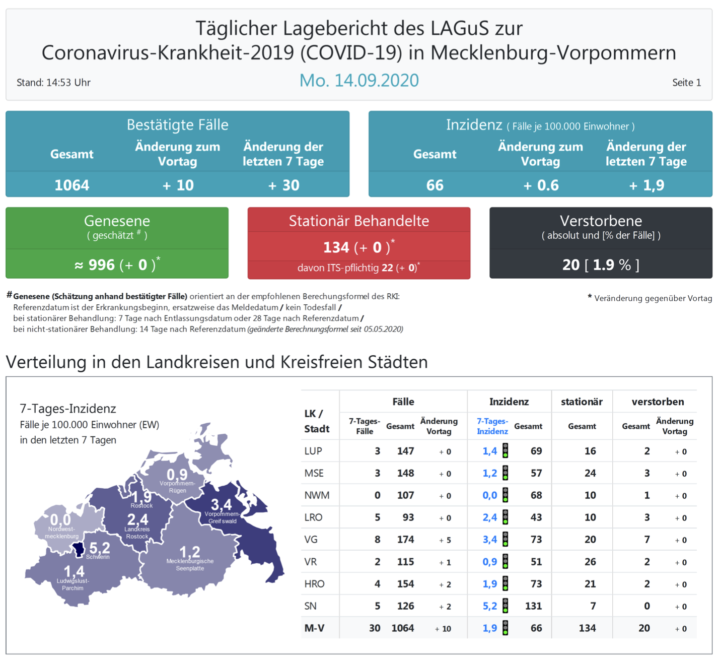 Landesweit müssen oder mussten den Angaben zufolge 134 Menschen in Kliniken behandelt werden, 22 (+0) von ihnen auf Intensivstationen.