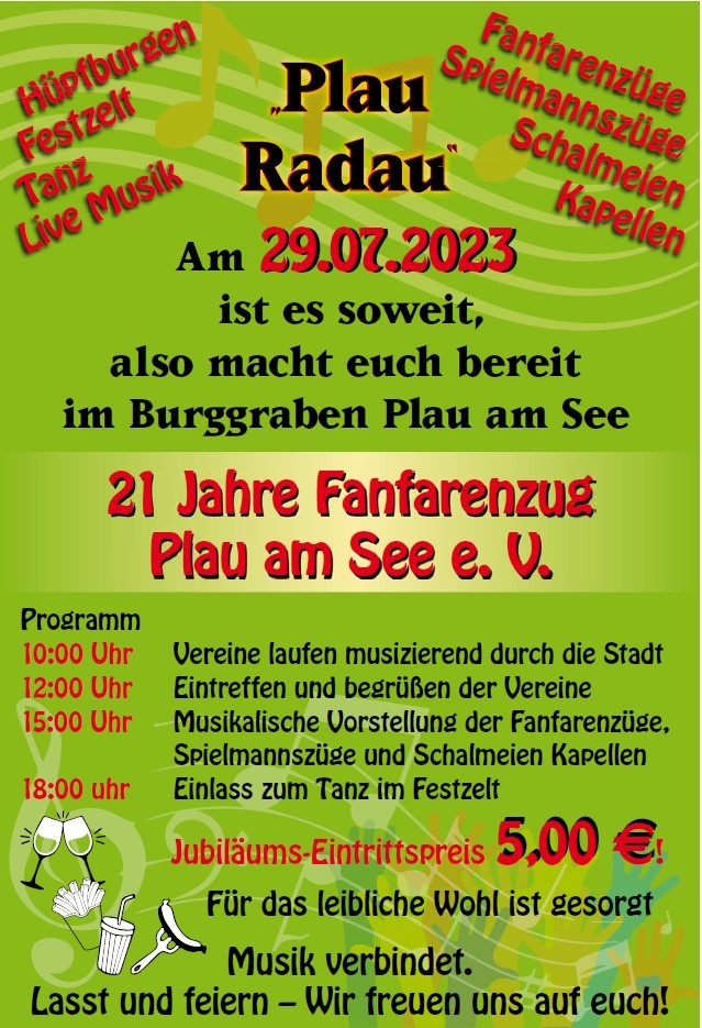 Im gemütlichen Miteinander folgen die Begrüßung durch den Bürgermeister und die Vorstellung der Vereine. Ab 15 Uhr wird es laut: Alle Vereine präsentieren nacheinander ihre stimmungsvollsten Stücke. Ab 18 Uhr startet unter dem Motto „PLAU RADAU“ die große Festzeltparty mit DJ Otti und der legendären RECOVER LIVE BAND. Anlässlich des Geburtstages wird vom Plauer Fanfarenzug lediglich ein Jubiläumseintrittspreis von nur 5 € erhoben.