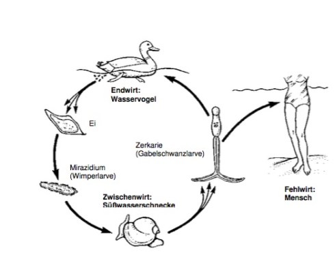 Beim Baden können sich die Zerkarien auch in die Haut des Menschen einbohren und eine Badedermatitis auslösen. Da der Mensch jedoch ein „Fehlwirt“ ist, werden sie bereits im Unterhautbindegewebe abgetötet.