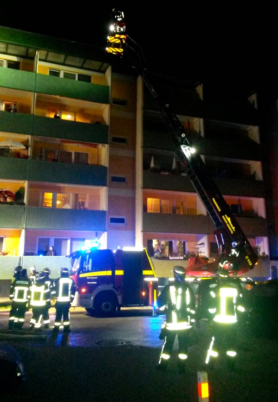 Wegen des stark verqualmten Treppenhauses mussten 25 Bewohner von der Feuerwehr per Drehleiter oder Fluchthaube evakuiert werden – darunter auch vier Kinder.