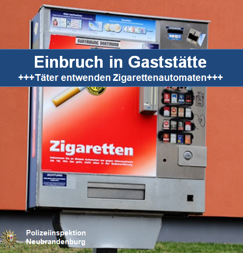 In der Zeit von gestern, 21 Uhr bis heute 7.45 Uhr ist in die Gaststätte am Sietower Knotenpunkt eingebrochen worden. Die Täter hebelten eine Einganstür auf, durchsuchten Möbel und entwendeten neben etwas Kleingeld aus einer Aufbewahrungsdose einen Zigarettenautomaten, der im Eingangsbereich stand. Zum Abtransport nutzten sie eine Sackkarre, die sie im Vorflur des Gebäudes fanden.