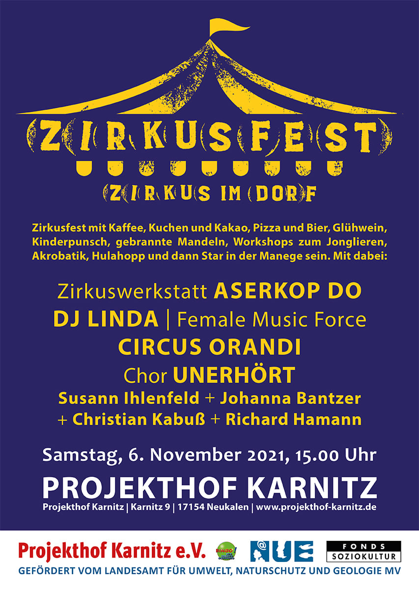 Zirkus im Dorf heißt am kommenden Sonnabend, 6. November im Projekthof Karnitz: Ein Zirkusfest für die Familie soll es werden. Um 15 Uhr beginnt das Feiern. Feiern heißt ja auch, miteinander zu quatschen, mit Leuten, die man kennt oder auch nicht (die sind oft interessanter). Dazu muss man zusammen sitzen – an langen Tischen; und auch was in der Hand haben – Kuchen, Kakao, Kaffee und Pizza und Bier, Glühwein, Kinderpunsch gebrannte Mandeln u.a.. Je nach Alter und nach Geschmack – die Theaterkneipe bedient alle.