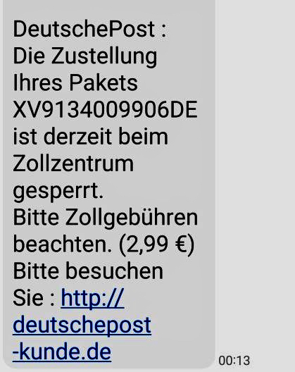 Der Zoll warnt vor falschen Mitteilungen auf das Smartphone, in denen behauptet wird, eine Sendung läge beim Zoll und es wären Gebühren fällig. In der Nachricht ist zudem ein Link enthalten. Bei dieser Art von Mitteilungen handelt es sich weder um Nachrichten des Zolls noch des jeweilen Transportunternehmens, sondern um eine Betrugsmasche. Der Empfänger soll nach Weiterleitung über den Link Überweisungen vornehmen bzw. seine Bankdaten preisgeben.