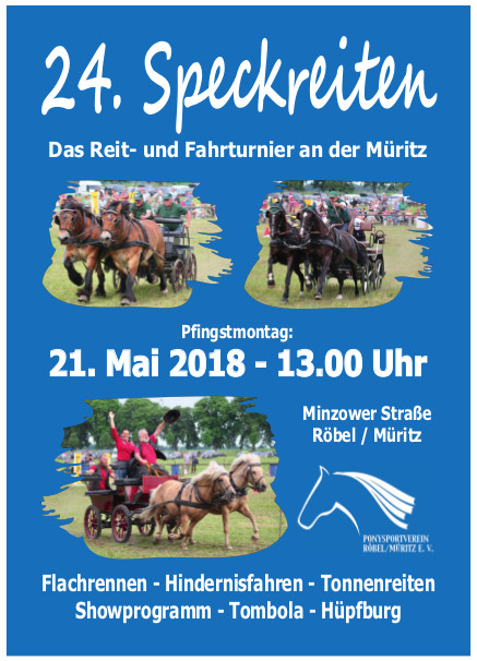 Alle Jahre wieder lädt der Ponysportverein Röbel/Müritz e.V. am Pfingstmontag zu seinem traditionellen Reit- und Fahrturnier „Speckreiten“ nach Röbel an die Minzower Straße ein. Das Pfingstturnier „Speckreiten“ ist alljährlich einer der Höhepunkte im Veranstaltungskalender der Stadt und lockt auch dieses Jahr wieder mit einem hochkarätigen Programm. Es ist offen für alle Pferde- und Ponybesitzer, das heißt, auch Freizeitreiter und -fahrer sind immer wieder gern gesehene Teilnehmer. Hier können Jung und Alt, Turniererfahrene und -einsteiger in 16 Prüfungen ihr Können zeigen.