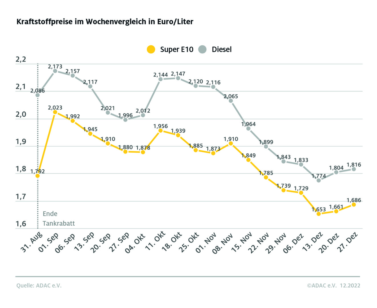 Zum Ende des Jahres müssen Autofahrer erneut etwas mehr für ihre Tankfüllungen bezahlen. Wie die aktuelle ADAC Auswertung der Kraftstoffpreise in Deutschland ergibt, kostet ein Liter Super E10 derzeit im bundesweiten Schnitt 1,686 Euro. Damit hat sich Benzin binnen Wochenfrist um 2,5 Cent verteuert. Um 1,2 Cent je Liter hat sich im selben Zeitraum Diesel verteuert. Derzeit muss man für den Selbstzünderkraftstoff im Schnitt 1,816 Euro bezahlen. Bereits in der Vorwoche waren die Spritpreise erstmals nach einer mehrwöchigen Talfahrt wieder gestiegen.