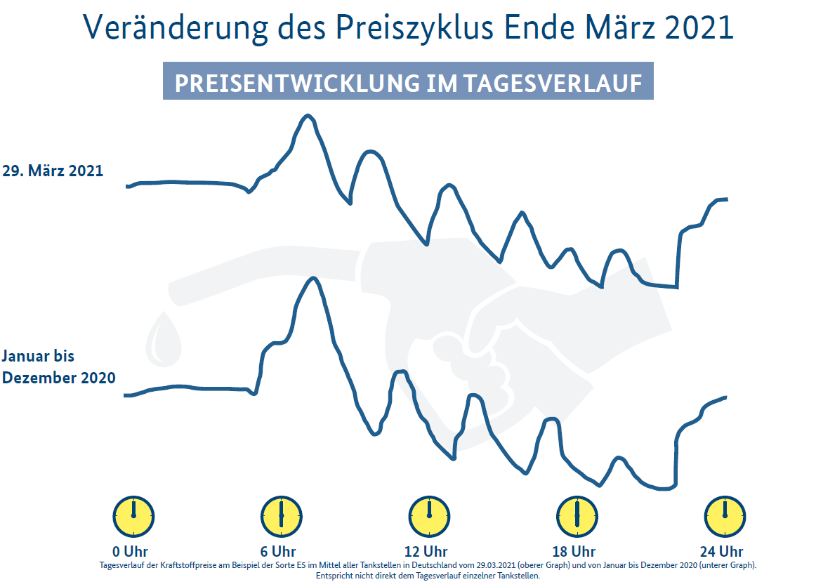 Die Kraftstoffpreise sind im Schnitt meist morgens (ca. 5 bis 8 Uhr) am höchsten und abends (ca. 18 bis 22 Uhr) am niedrigsten, wobei es allerdings auch abends kleine Preisanhebungen gibt. Dazwischen schwanken die Preise oft erheblich. Am späten Abend werden die Preise dann bei einem Großteil der Tankstellen, die noch geöffnet haben, wieder deutlich angehoben und bleiben nachts auch auf einem vergleichsweise hohen Niveau (siehe Info-Grafik „Tagesverlauf 2020“).