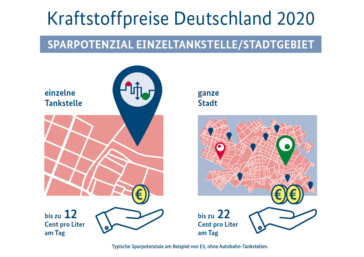 Die wichtigsten Ergebnisse der Marktuntersuchungen 2020: An ein und derselben Tankstelle gibt es im Schnitt Preisunterschiede von ca. 12 Cent/Liter am Tag. Vergleicht man die Tankstellen in einer Stadt, gibt es im Schnitt sogar Preisunterschiede von bis zu ca. 22 Cent/Liter am Tag.