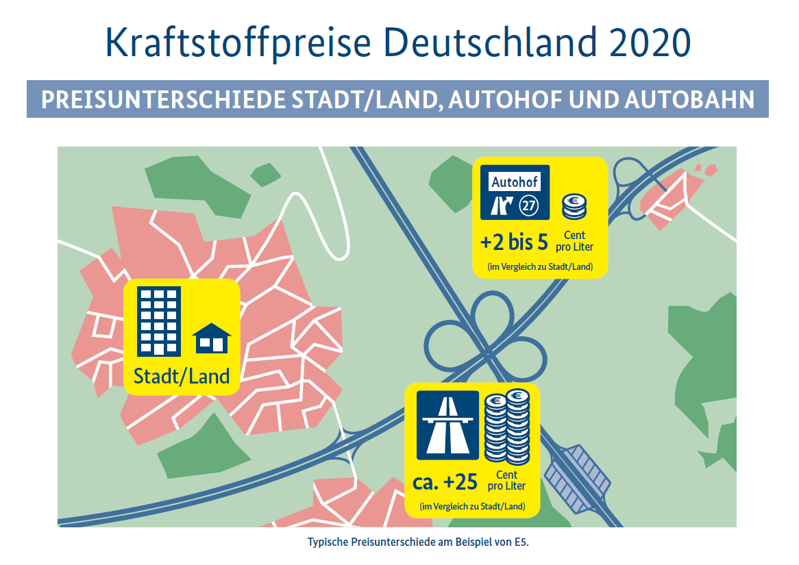 An Autohöfen in Autobahnnähe sind die Preise im Vergleich zu anderen Straßentankstellen zwar häufig etwas teurer (+2-5 Cent/Liter), aber wer an einer Autobahntankstelle tankt, muss meist mit noch sehr viel höheren Preisen rechnen. Diese liegen zumeist etwa 25 Cent/Liter über den Preisen an den Straßentankstellen. Es gibt allerdings einige wenige Autobahntankstellen, die trotz ihrer Lage keine deutlich teureren Preise erheben. Diese lassen sich gut über Tank-Apps ausfindig machen.