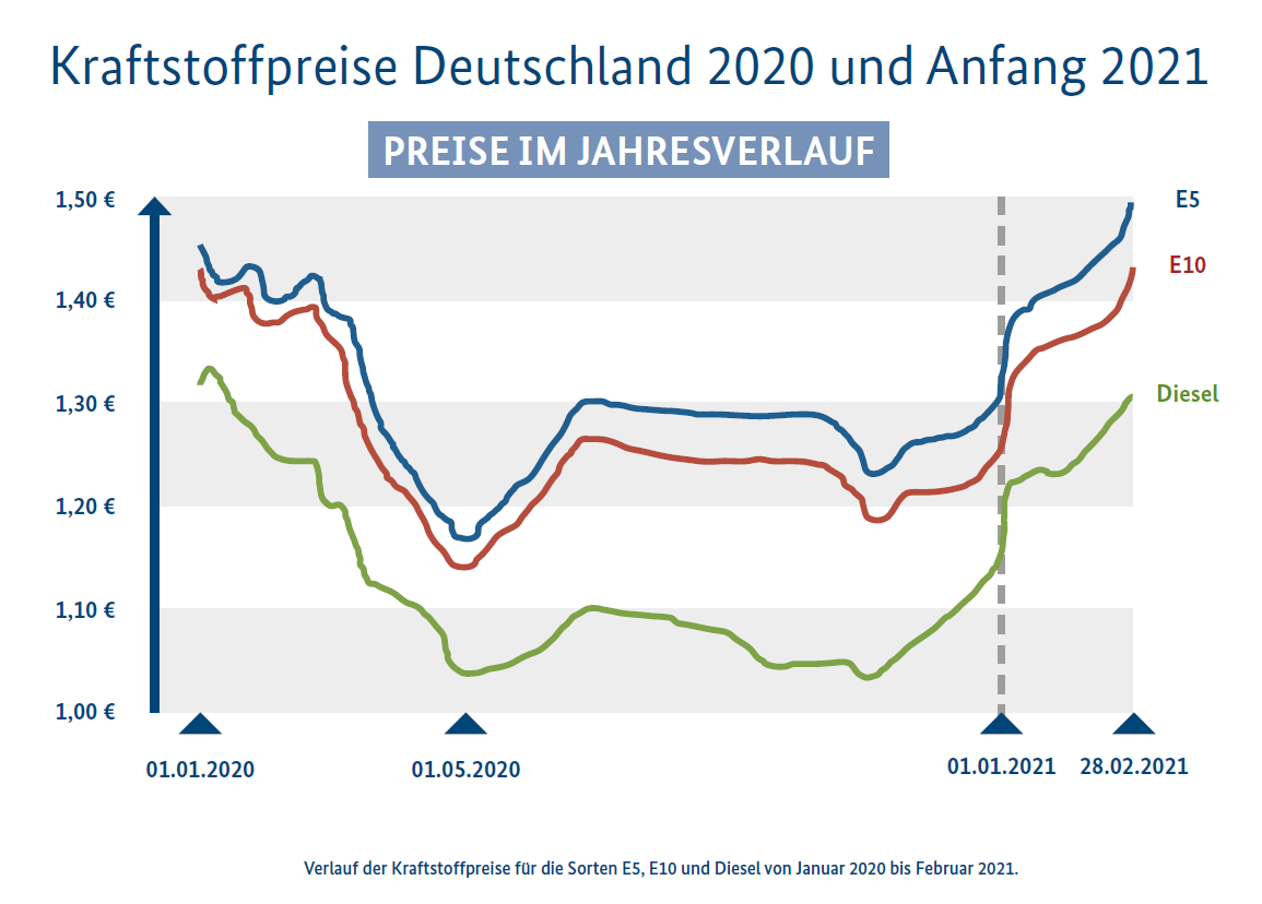 Die Höhe der Kraftstoffpreise unterlag in den vergangenen Monaten starken Schwankungen. Während im Frühjahr 2020 mit einem unter anderem pandemiebedingt sehr niedrigen Rohölpreis auch die Kraftstoffpreise ein Tief erreicht hatten, lagen sie schon Ende Februar 2021 wieder ähnlich hoch wie Anfang 2020. Neben dem Anstieg des Rohölpreises und anderen Faktoren sind hierfür auch die Wiederanhebung der Mehrwertsteuer und die Einführung der CO2-Bepreisung zum 1. Januar 2021 mitverantwortlich
