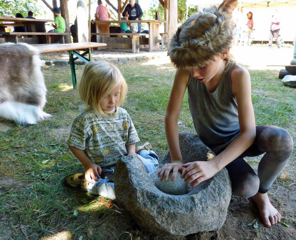 So kann in einer steinzeitlichen Trogmühle Mehl gemahlen und anschließend als Knüppelkuchen verarbeitet werden, Pfeil und Bogen gebaut werden, es kann Steinzeitschmuck gebastelt werden und vieles mehr.