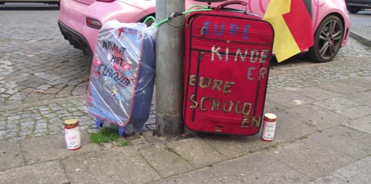 Zwei verdächtige Reisekoffer an einem Laternenmast haben heute Vormittag für einen Polizeieinsatz in Neubrandenburg gesorgt. Sie waren mit einem Zahlenschloss am Mast befestigt und mit je einem Schriftzug versehen. Zur Gefahrenabwehr wurde die Straße vorsorglich für den Fußgänger- und den Fahrzeugverkehr gesperrt. Bei dem ersten Koffern handelte es sich um einen roten Reisekoffer, aus dem eine Deutschlandfahne ragte und auf dem der Schriftzug “ EURE KINDER EURE SCHULDEN“ stand. Im unteren Bereich war eine kleine Deutschlandfahne aufgebracht.