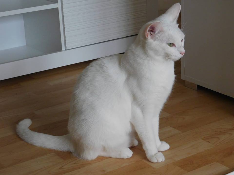 – weiße BKH-Mix-Katze, weiblich, ein grünes und ein blaues Auge