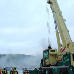 Unterdessen kämpfen die Feuerwehrleute weiter gegen die Flammen, die sich einfach nicht ersticken lassen wollen. Andere Kameraden legen Sperren ins Wasser, damit sich Schadstoffe nicht ausbreiten können.