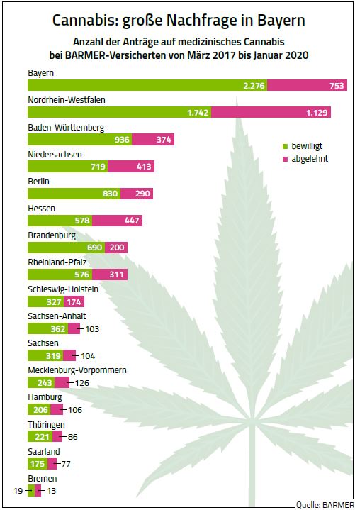 Nach der BARMER-Analyse ist die Zahl der Anträge auf Kostenübernahme Cannabis-haltiger Arzneimittel in Mecklenburg-Vorpommern in den vergangenen Jahren leicht gestiegen. Während es sich von März bis einschließlich Dezember 2017 um 74 Anträge gehandelt habe, waren es im darauffolgenden Jahr 129 und im Jahr 2019 insgesamt 156 Anträge.