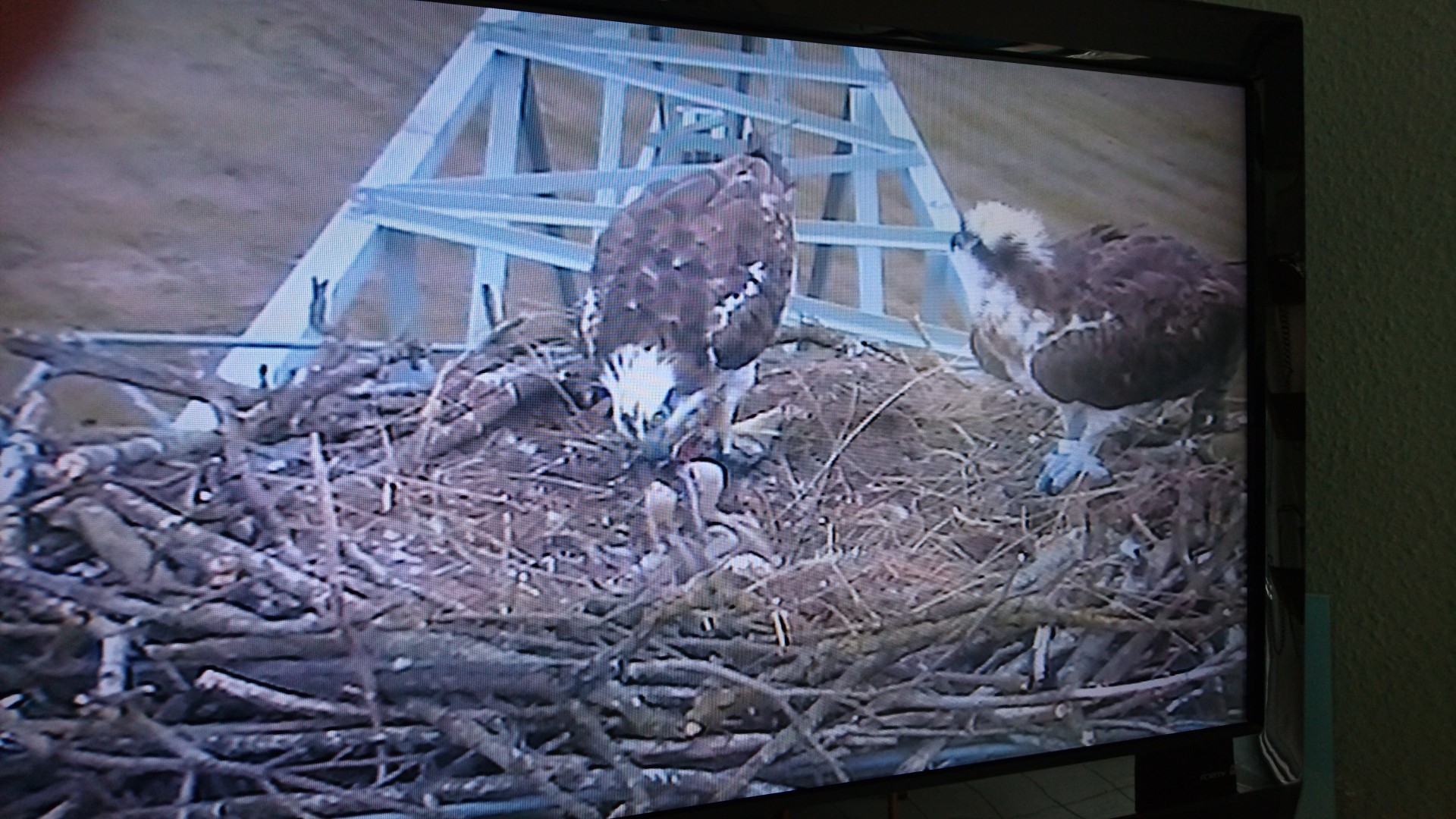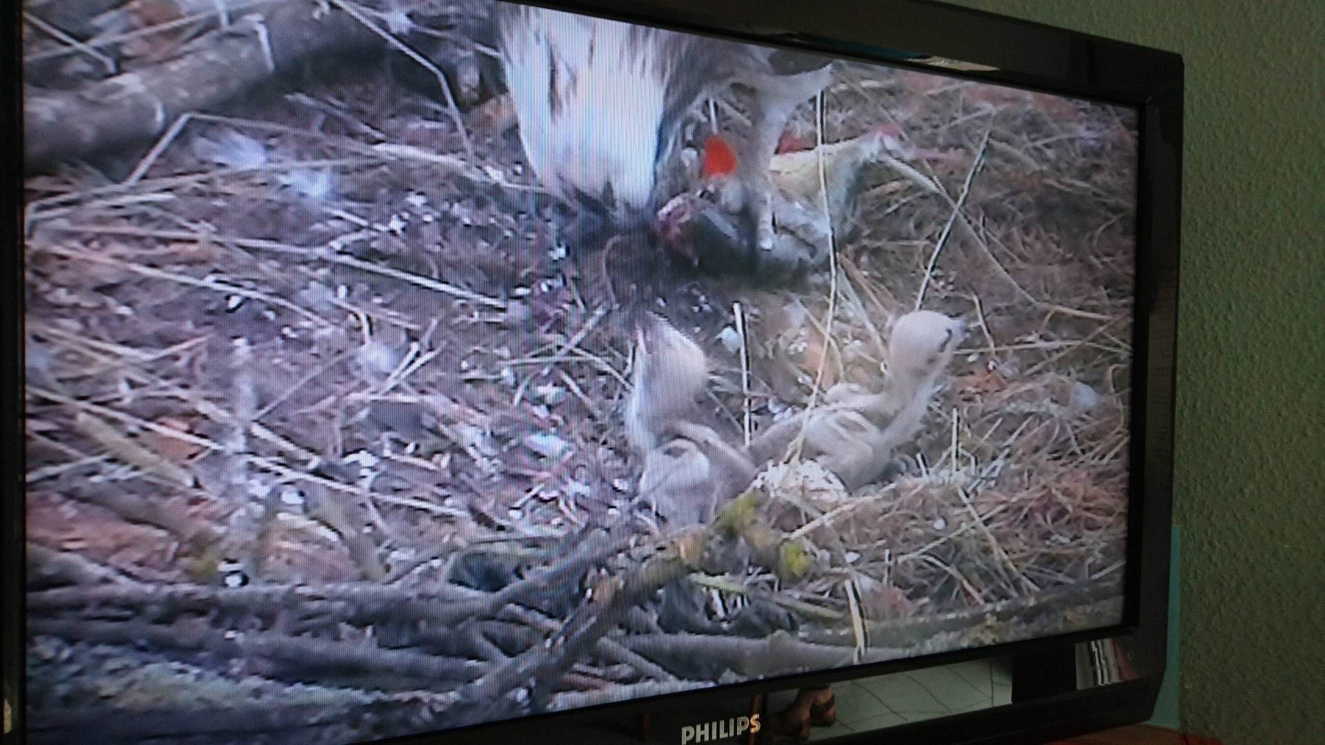 Wie auf Zuruf kam auch das Männchen und brachte am Sonntagmorgen eine Rotfeder, die das Weibchen an die Küken verfütterte. Die kleinen Fischadler sehen aus wie ein etwas längliche Mini-Wollknäule mit den für Fischadler typischen „schwarzen Augenbinden.“