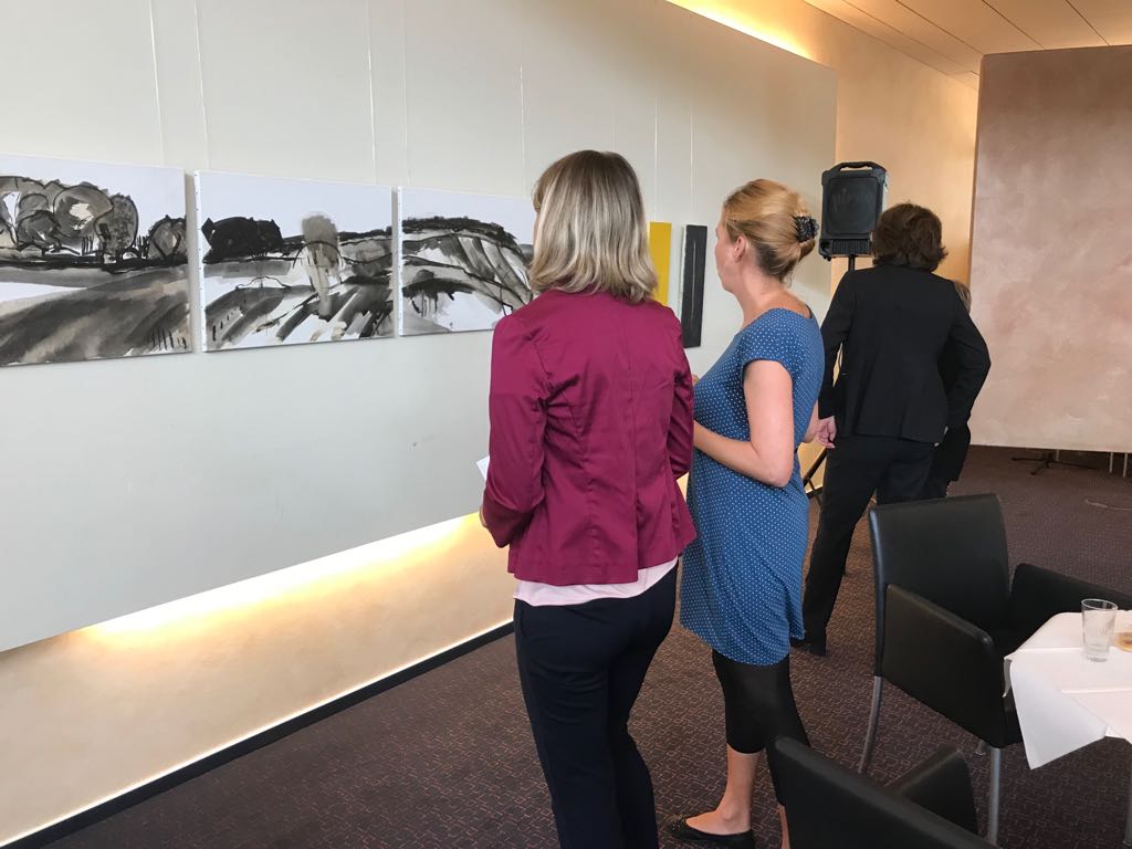 „Die Inspiration zu dieser Bilderserie findet die Künstlerin an Originalschauplätzen und in der persönlichen Begegnung mit Mensch, Tier und Natur. Skizzen oder Smartphone-Schnappschüsse dienen als Ideensammlung. Diese Ideen und Eindrücke wiederum verarbeitet Annette Stüsser-Simpson in unterschiedlichster Form: mal naturalistisch gehalten in Acryl oder abstrakt und halbabstrakt auf Papier oder sie nutzt Elemente des Kalligrafischen und kombiniert diese mit wirklichkeitsgetreuen Formen“, so Andrea Perlick über die Werke von Annette Stüsser-Simpson.