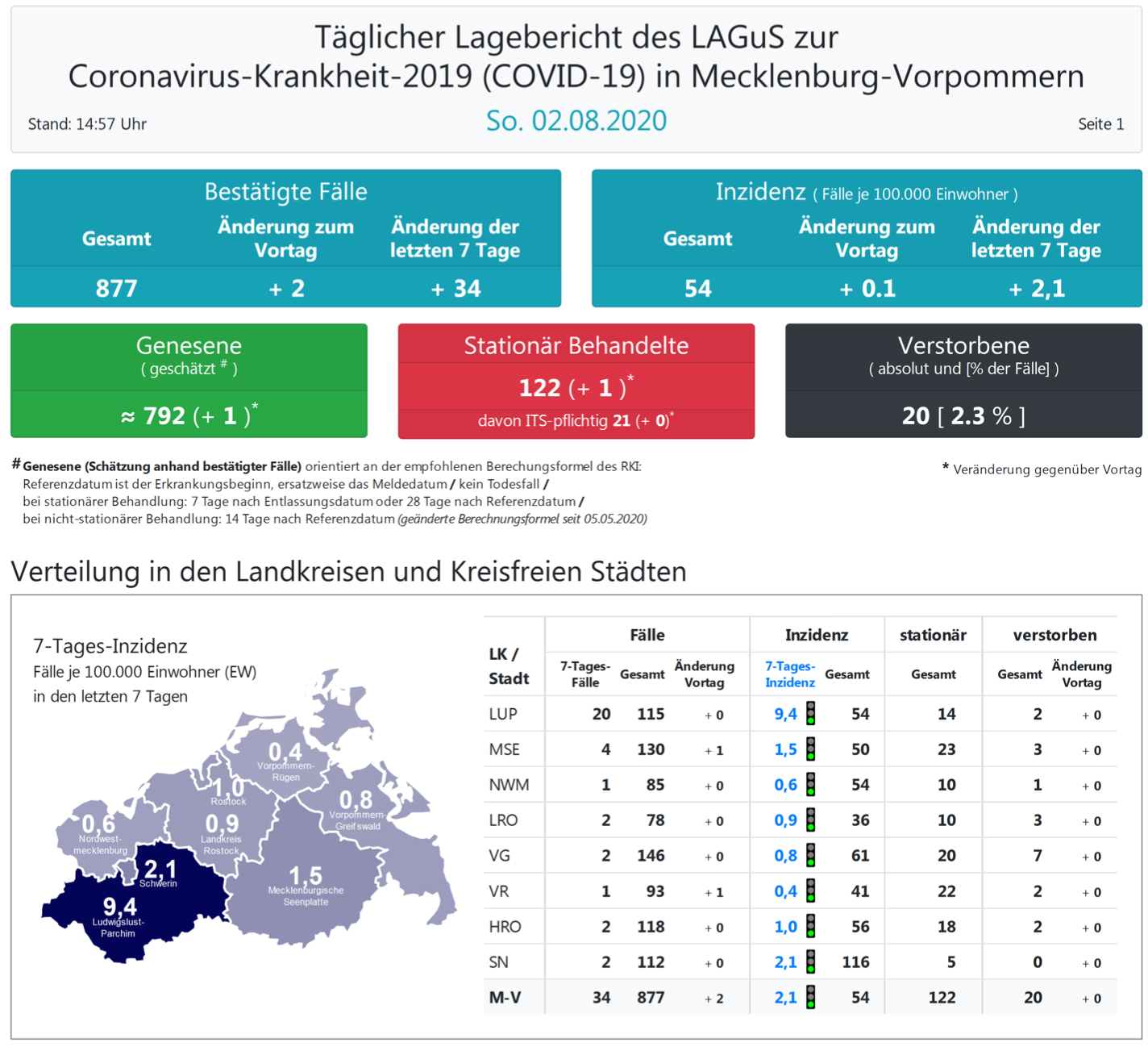 Laut einer Schätzung des Robert Koch-Instituts (RKI) sind in Mecklenburg-Vorpommern 792 Personen der positiv getesteten Menschen von einer Covid-19-Erkrankung genesen. Insgesamt gab es bislang 20 Todesfälle im Land.